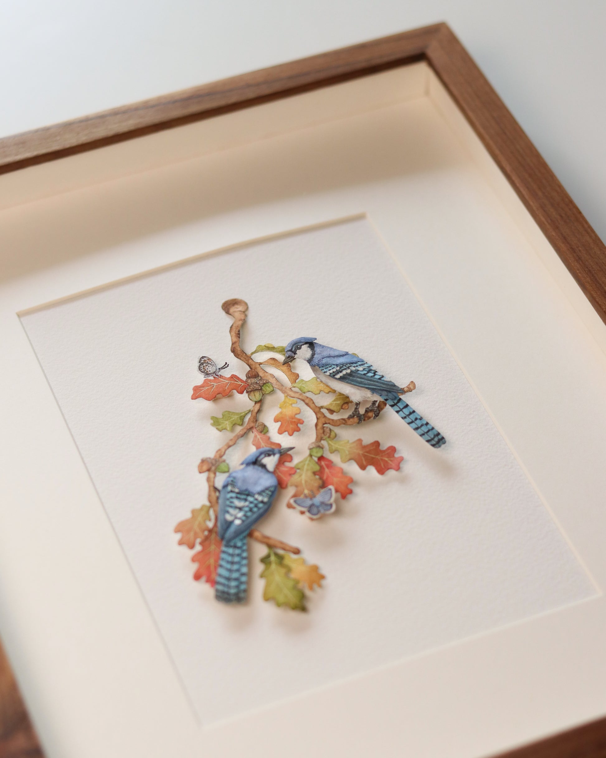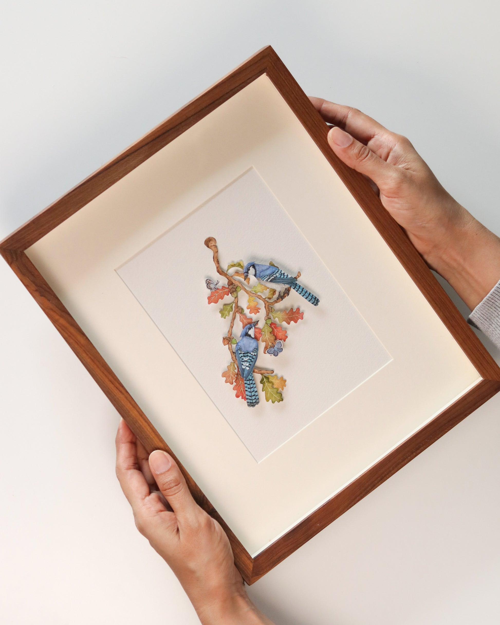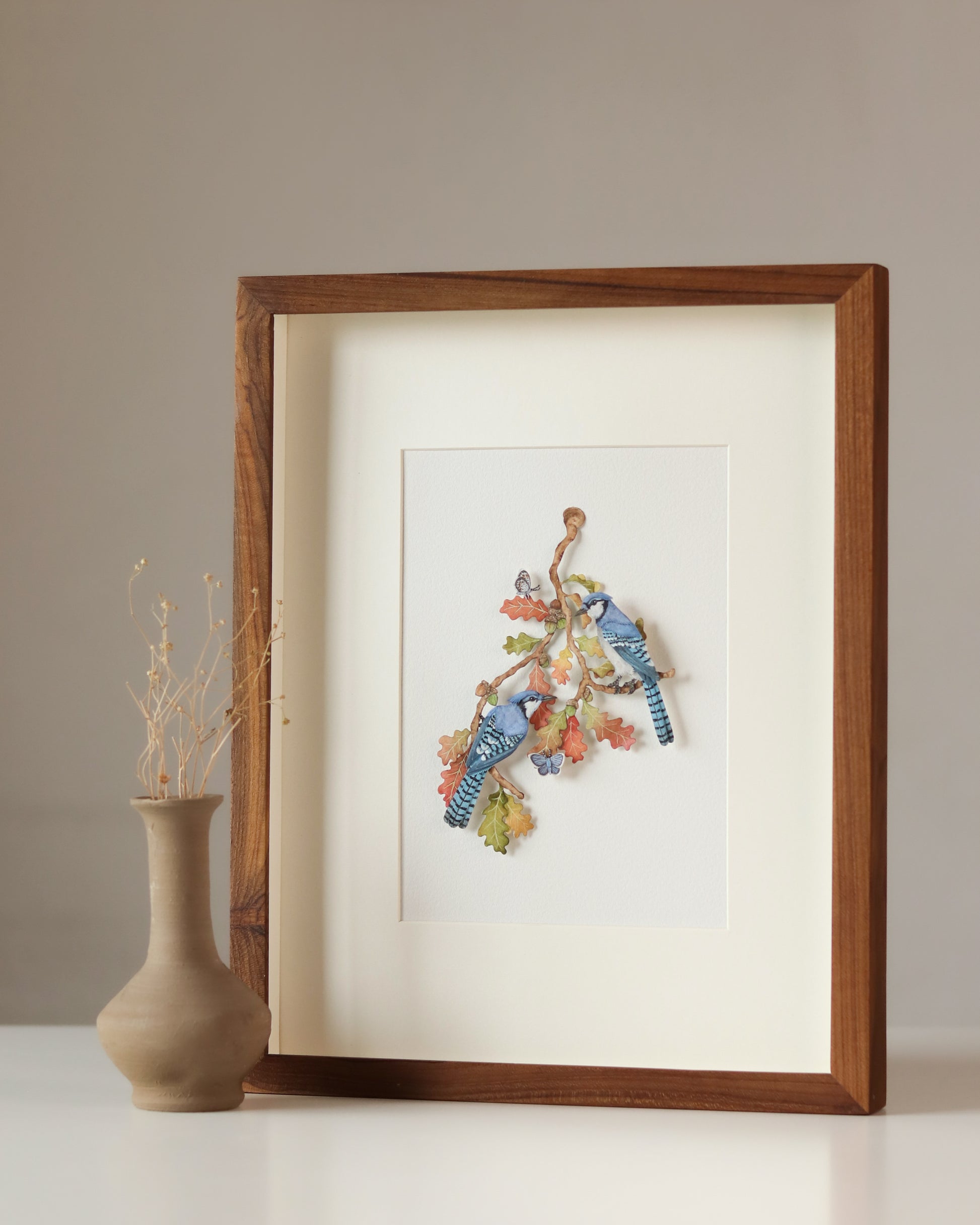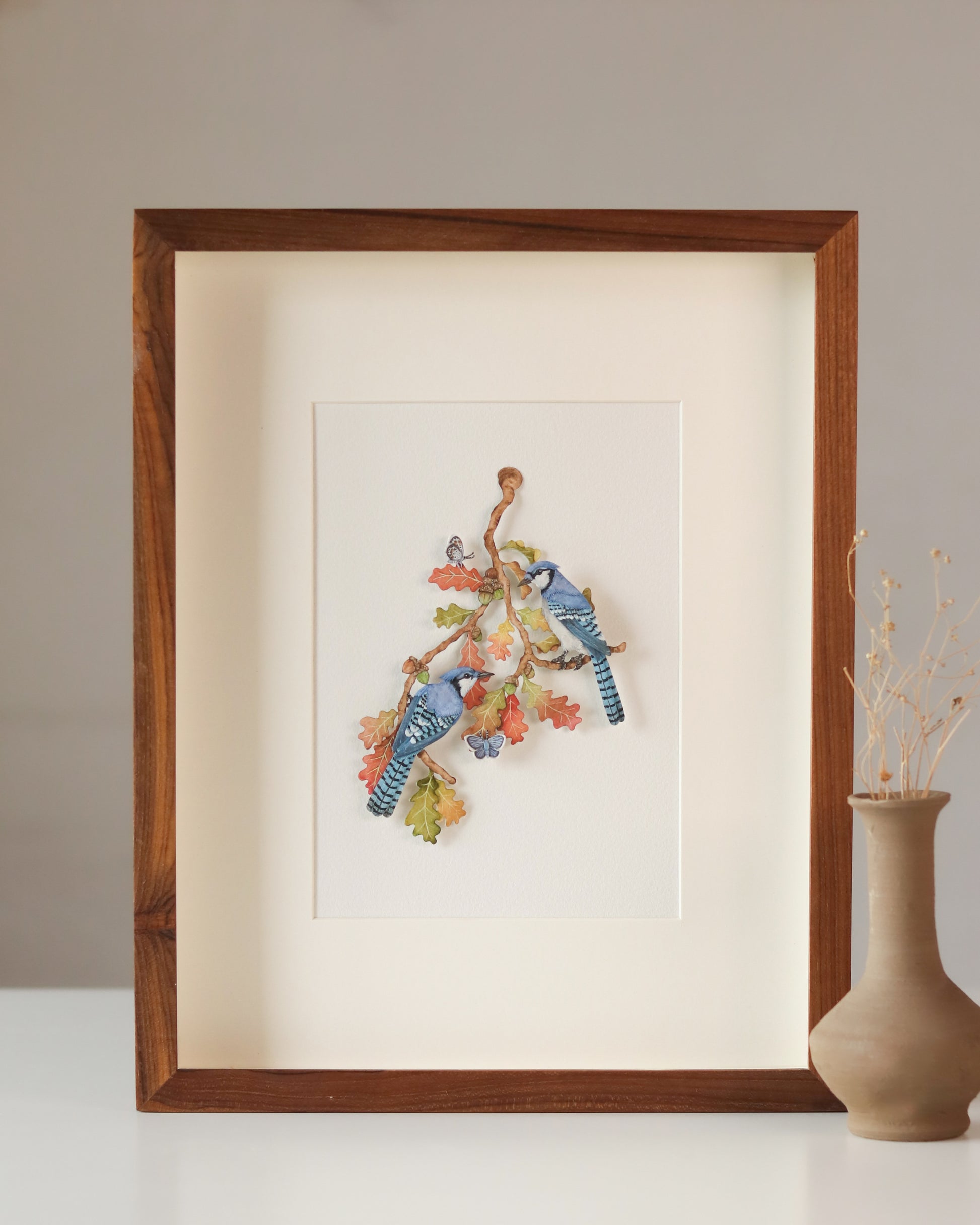 The first in our Birds in Blooms series, this intricate paper artwork captures two striking Blue Jays perched among autumn oak leaves. Handcrafted with fine detail, it celebrates the harmony of birds and seasonal flora in miniature form.