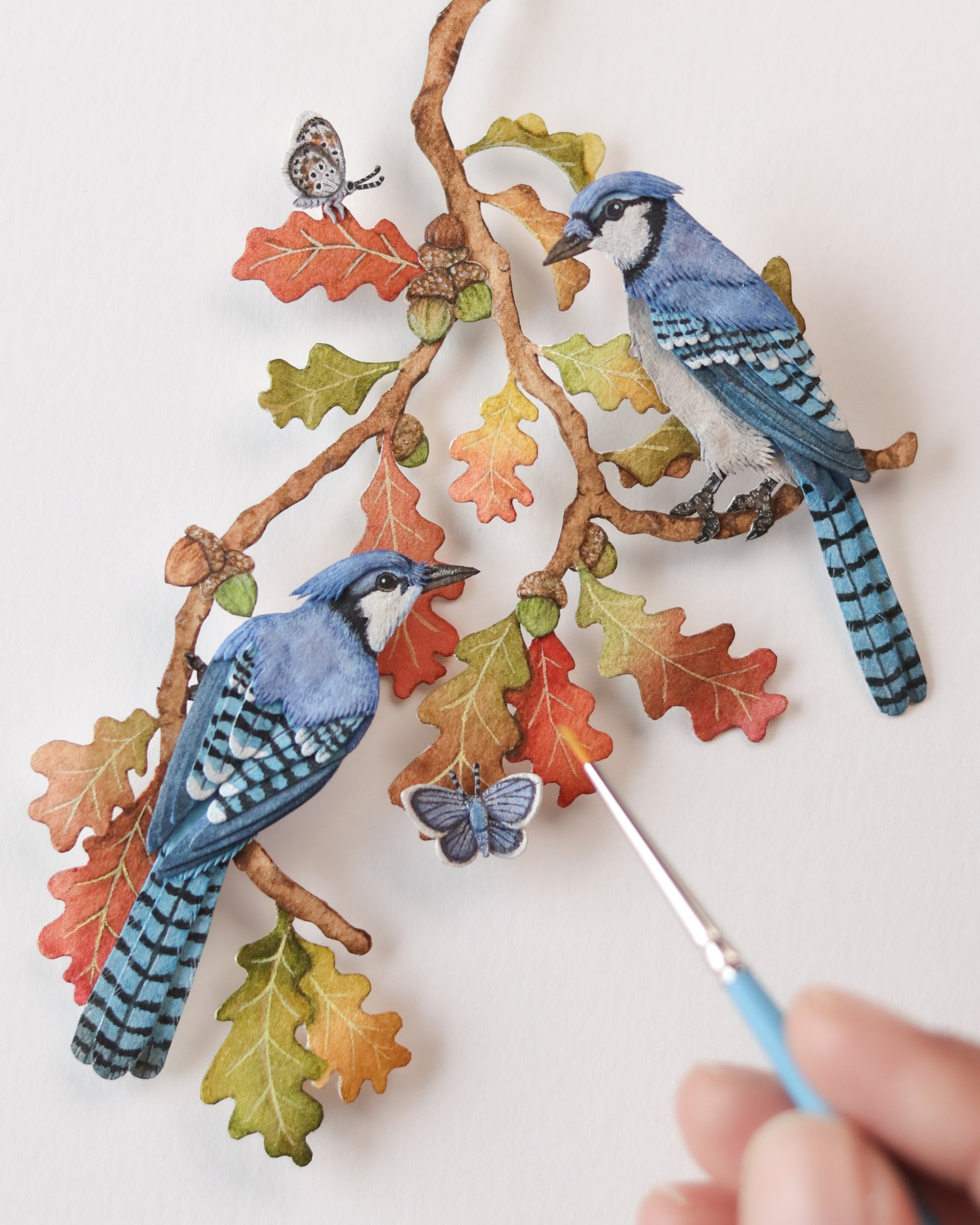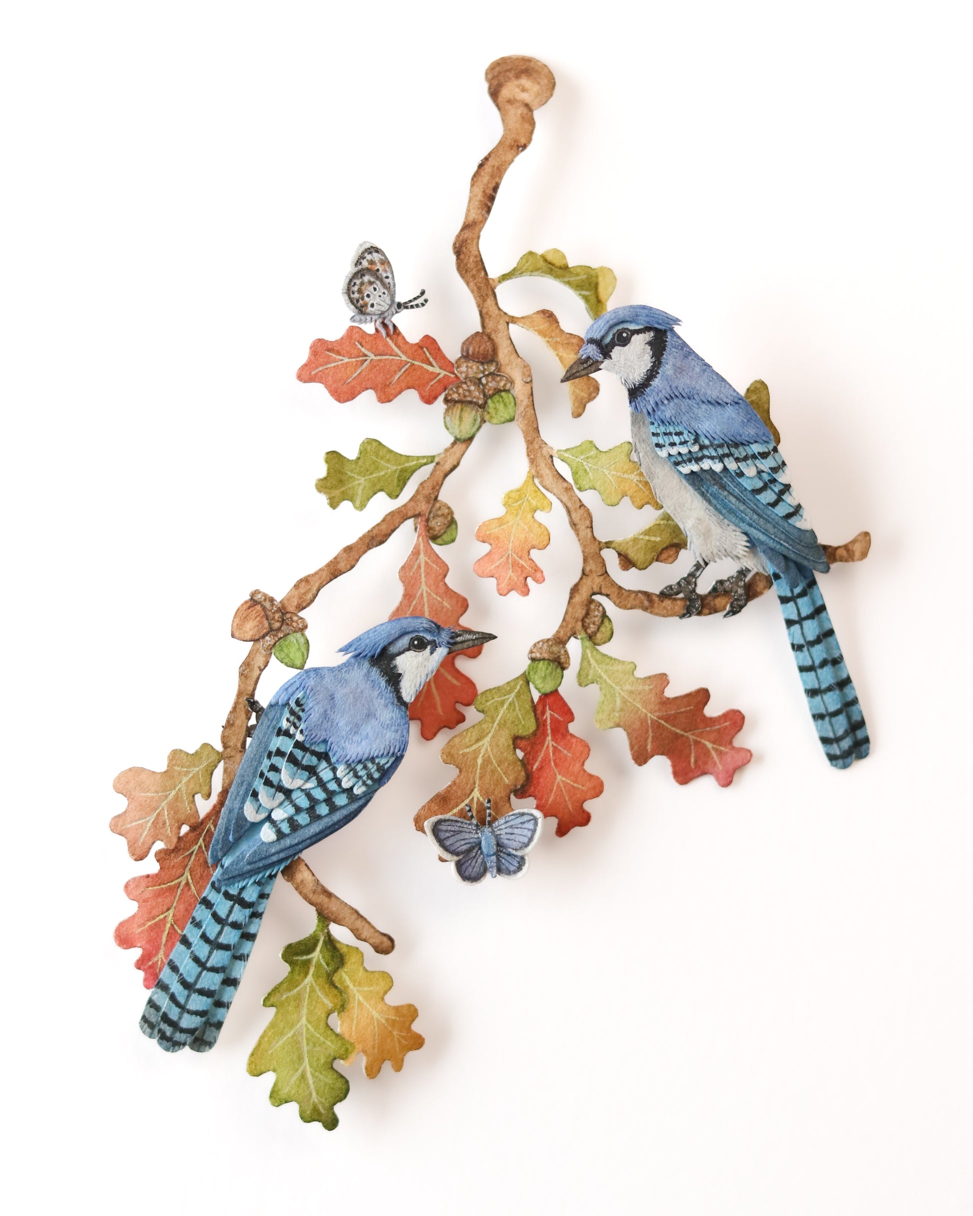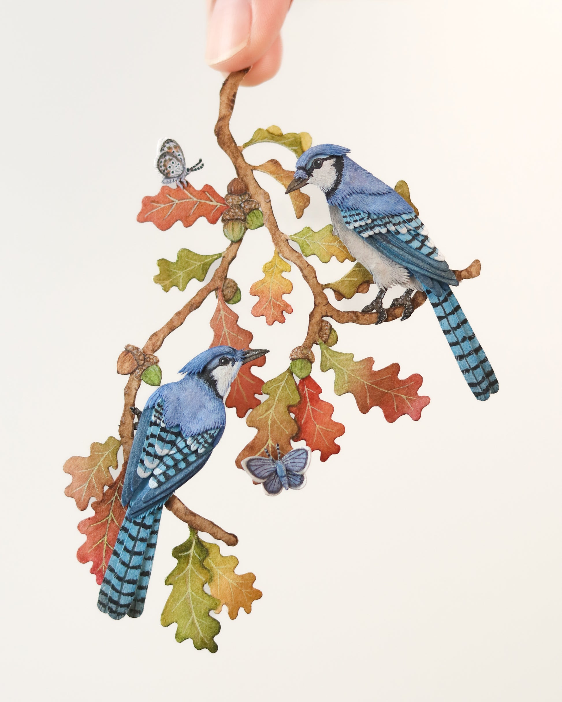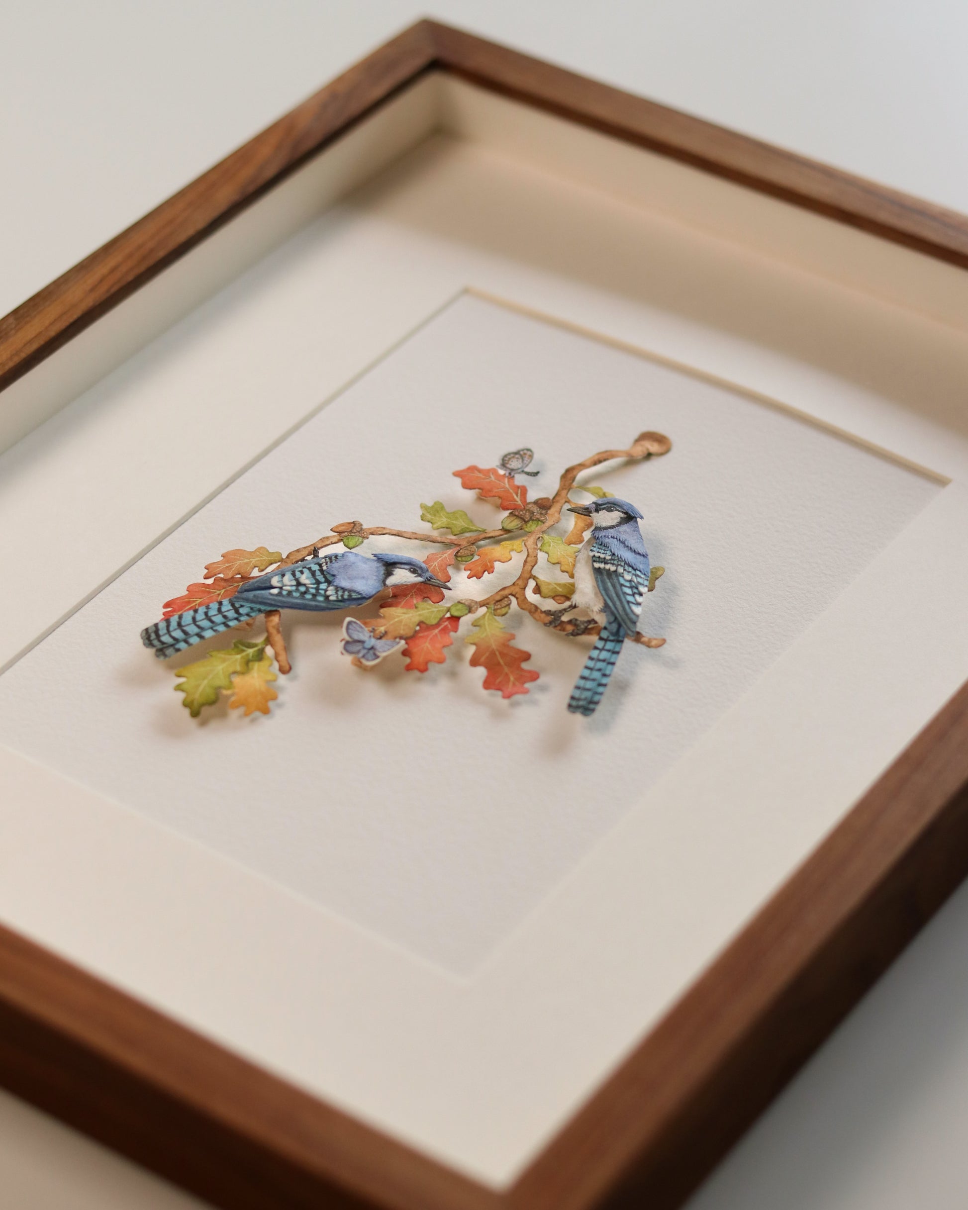 The first in our Birds in Blooms series, this intricate paper artwork captures two striking Blue Jays perched among autumn oak leaves. Handcrafted with fine detail, it celebrates the harmony of birds and seasonal flora in miniature form.