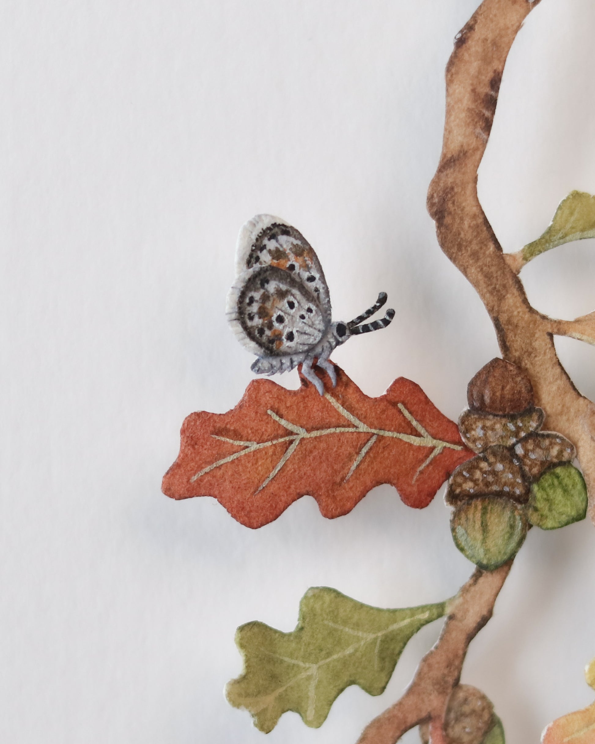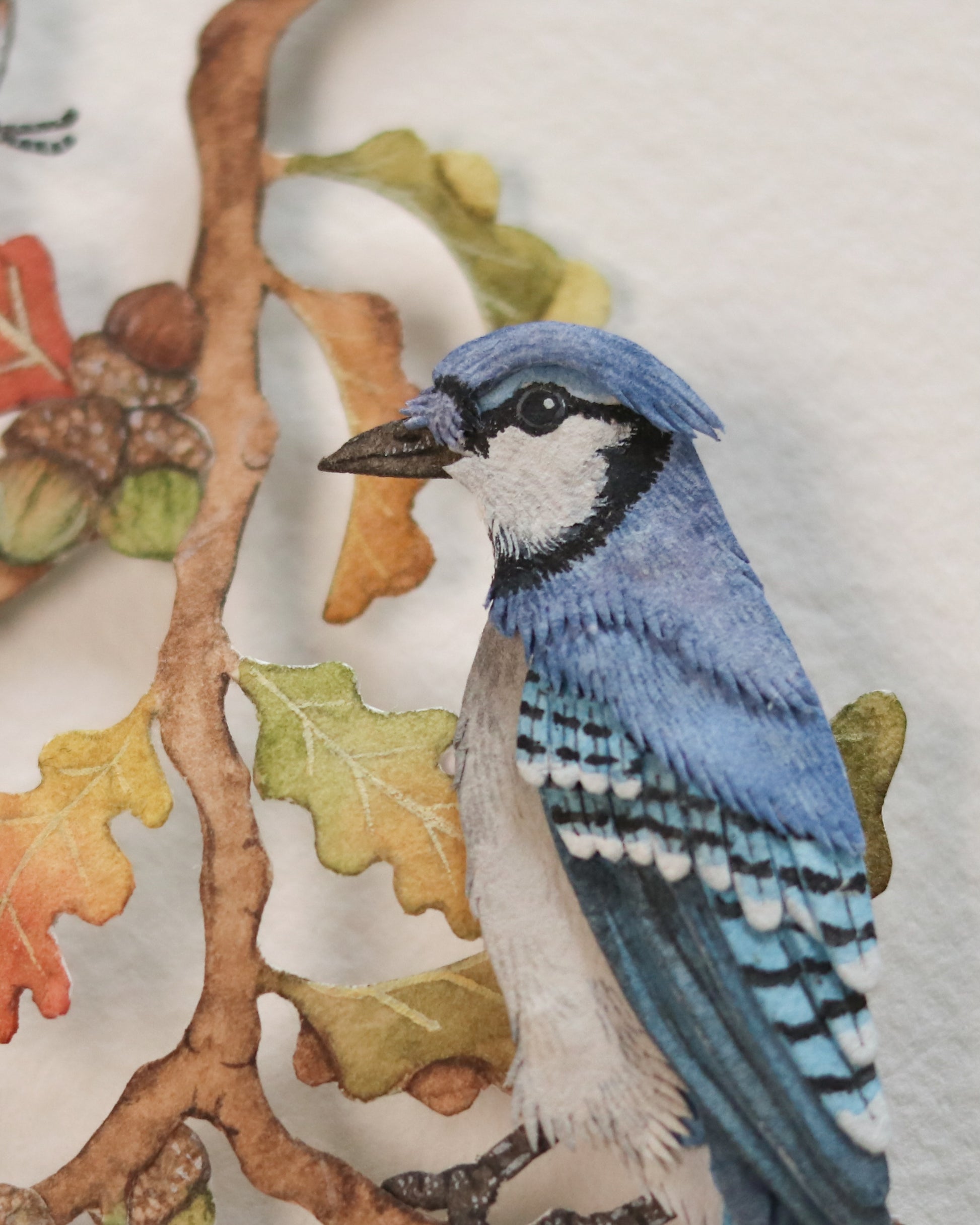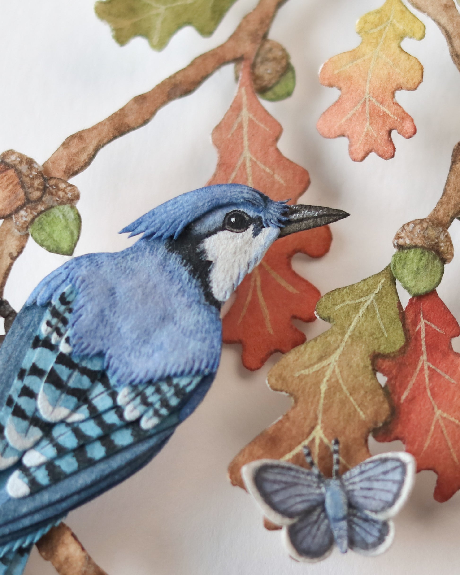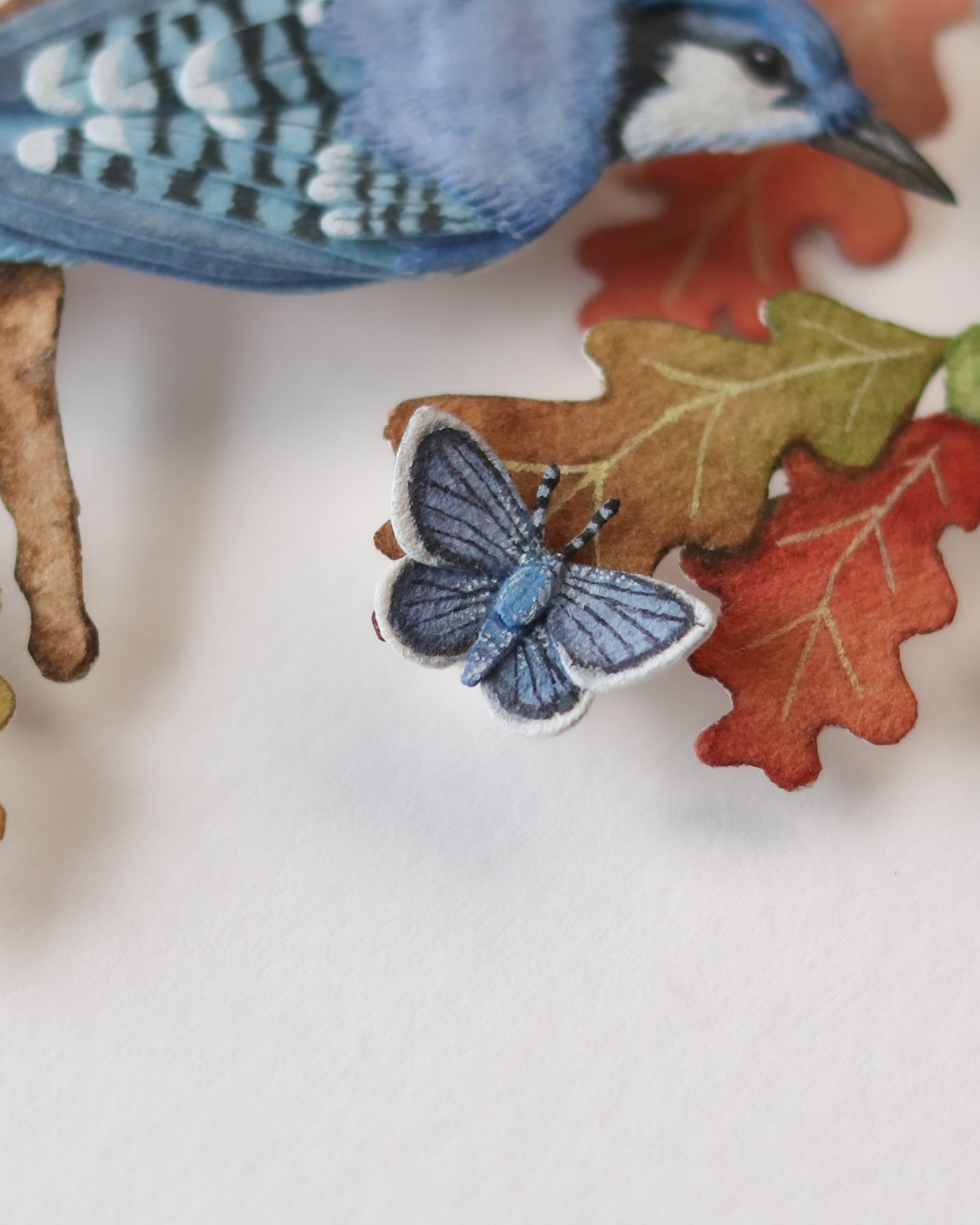 The first in our Birds in Blooms series, this intricate paper artwork captures two striking Blue Jays perched among autumn oak leaves. Handcrafted with fine detail, it celebrates the harmony of birds and seasonal flora in miniature form.