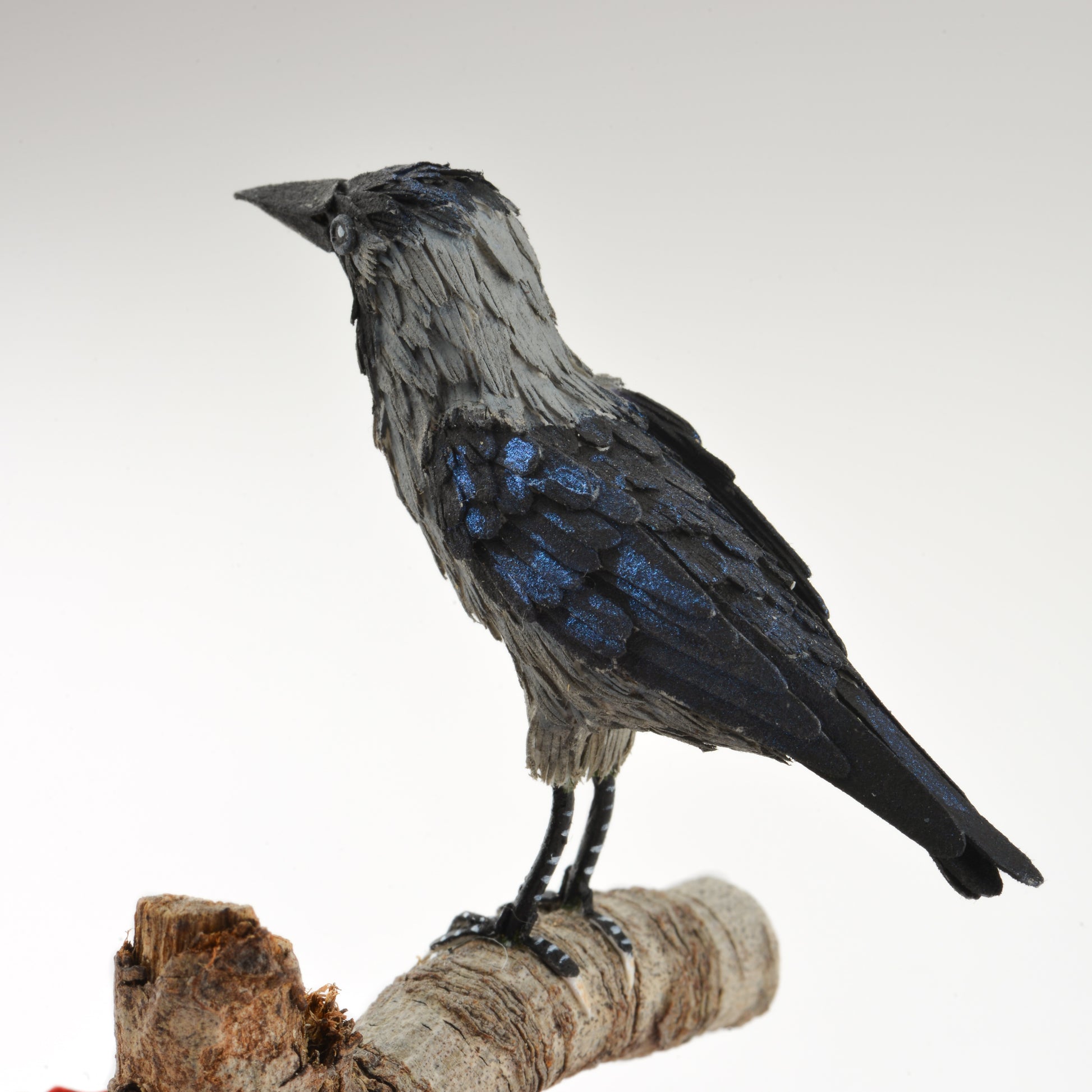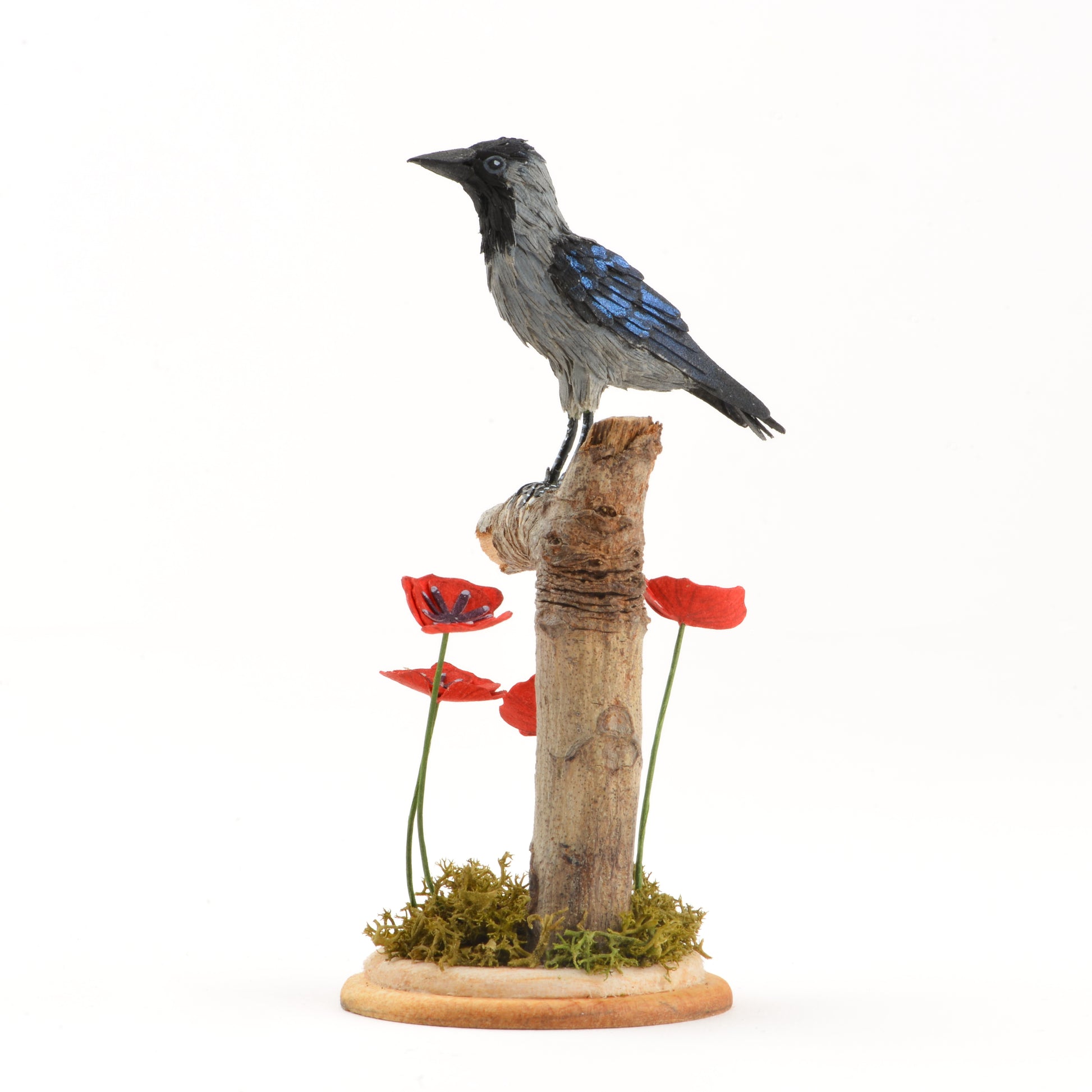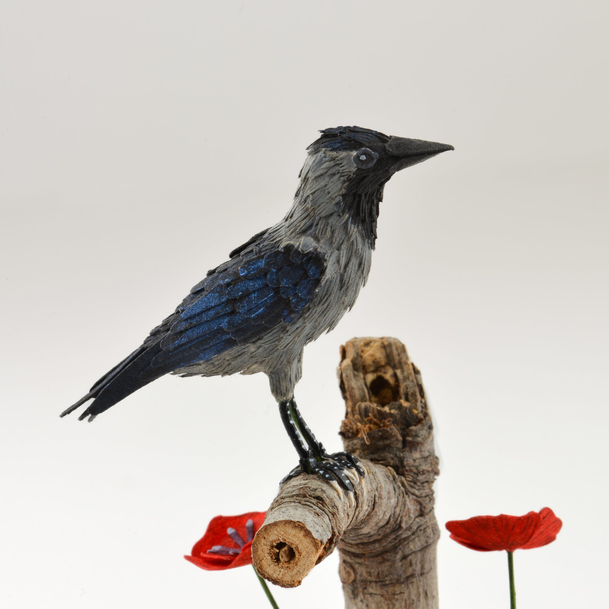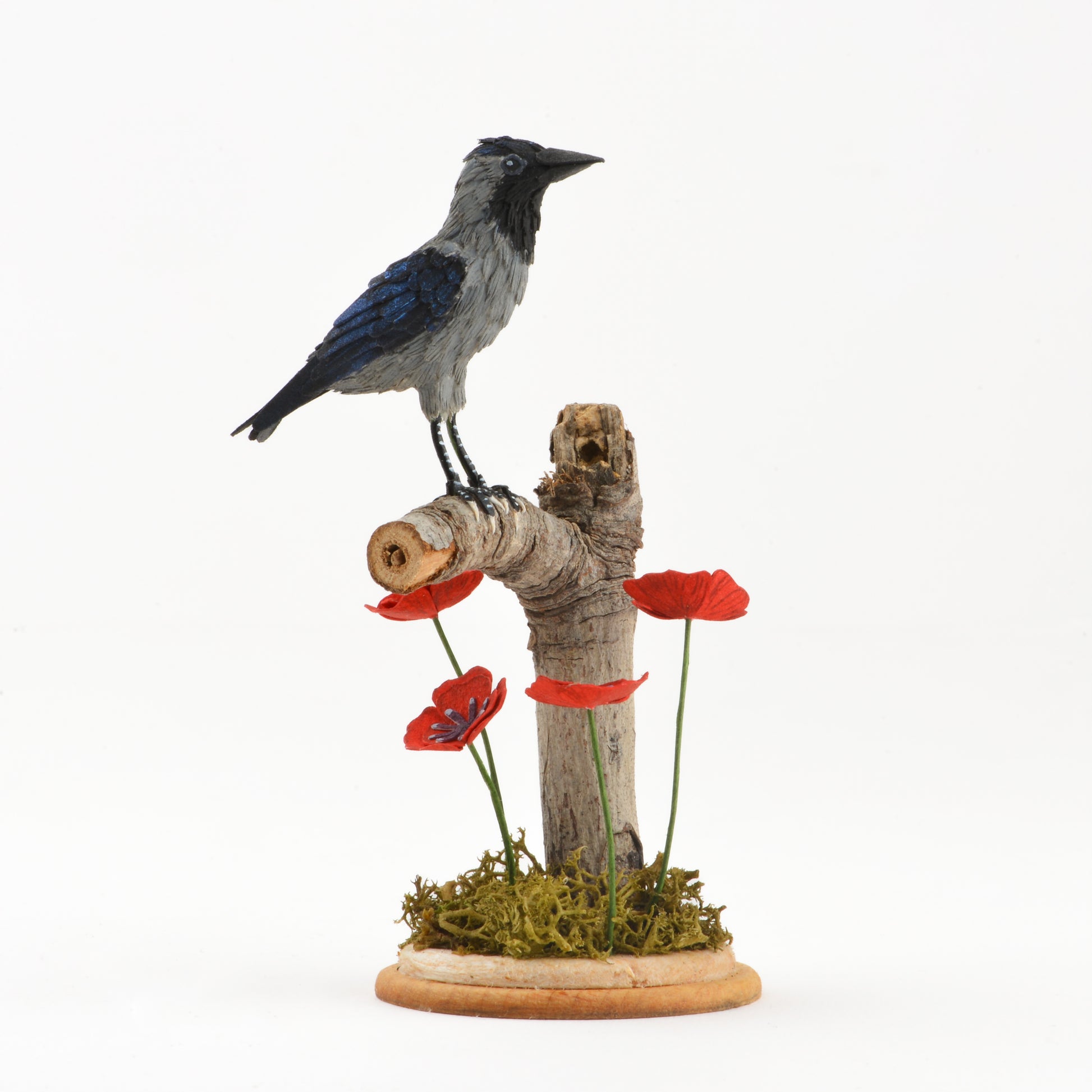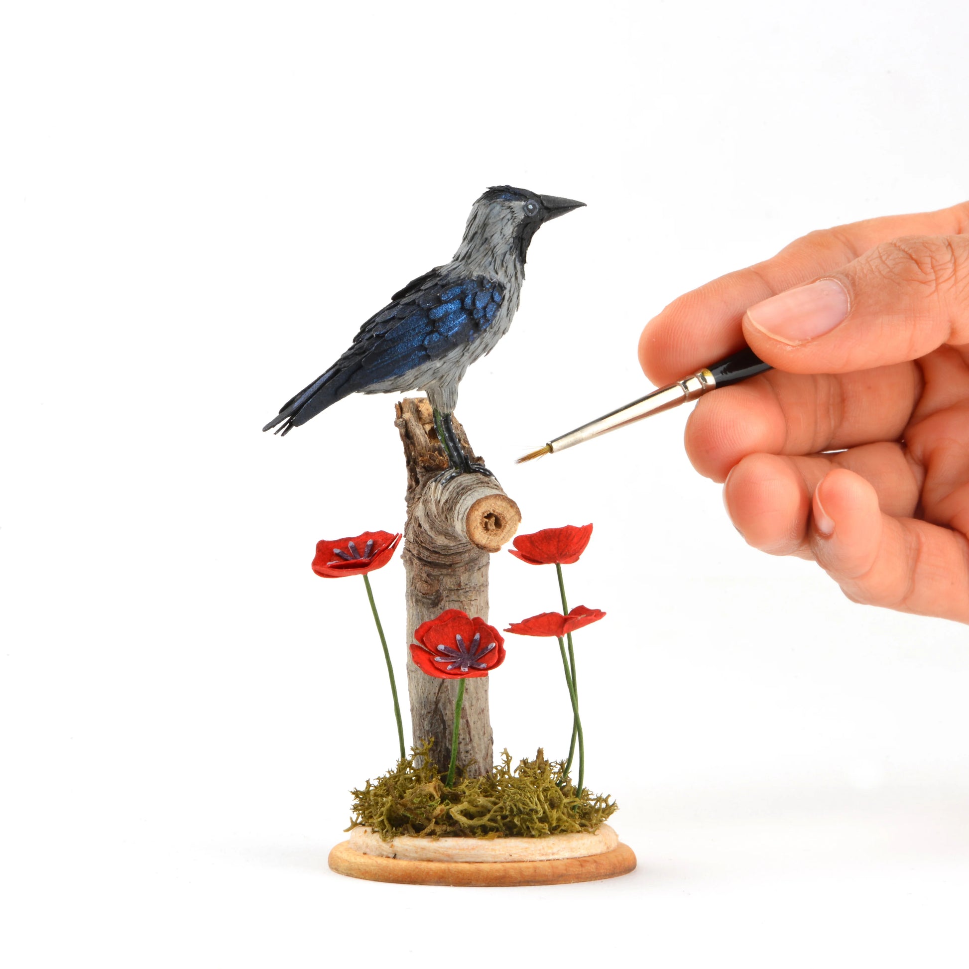 Introducing our enchanting Miniature Paper Sculpture—a meticulous creation capturing the essence of nature and avian beauty. This delicate masterpiece features a house crow gracefully perched on a real wood twig, its intricate details bringing the sculpture to life. The avian companion is thoughtfully surrounded by vibrant paper poppy flowers, each petal and hue carefully crafted to evoke the serene charm of a blossoming field. This unique piece seamlessly blends the authenticity of nature with the artistry of paper, making it a captivating addition to any space. Immerse yourself in the world of fine craftsmanship with this exquisite creation—a testament to the harmony between the delicate intricacies of paper art and the timeless allure of the natural world.