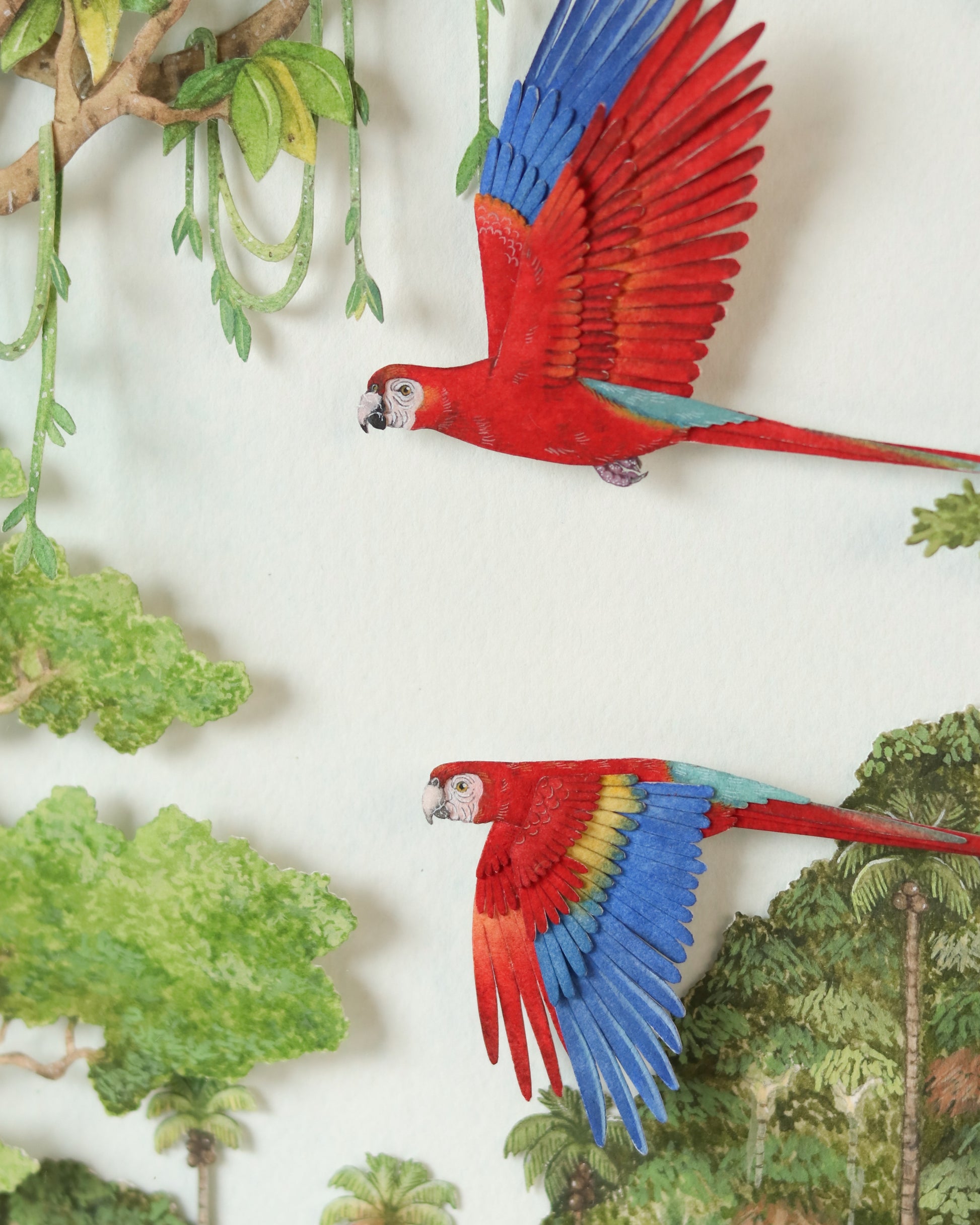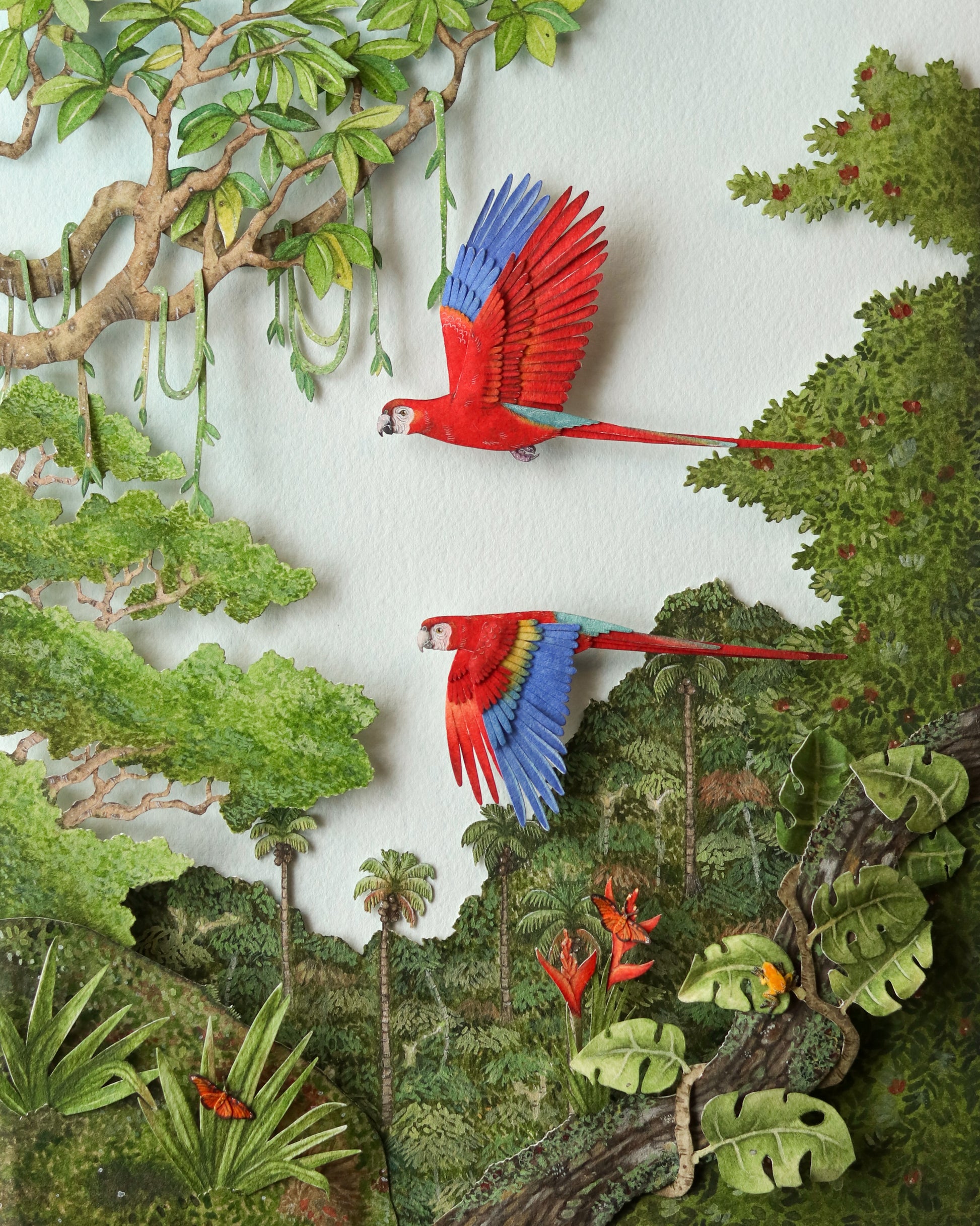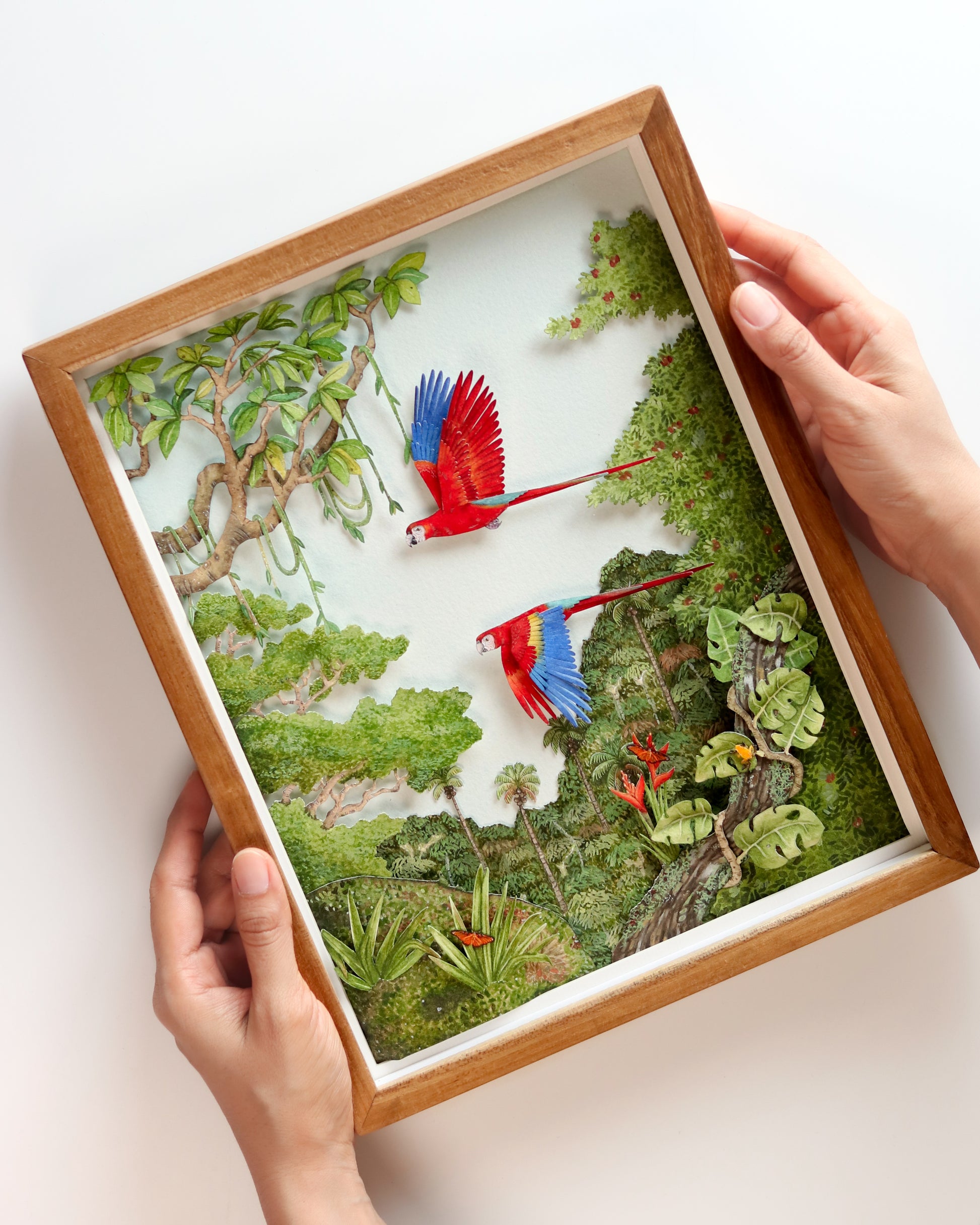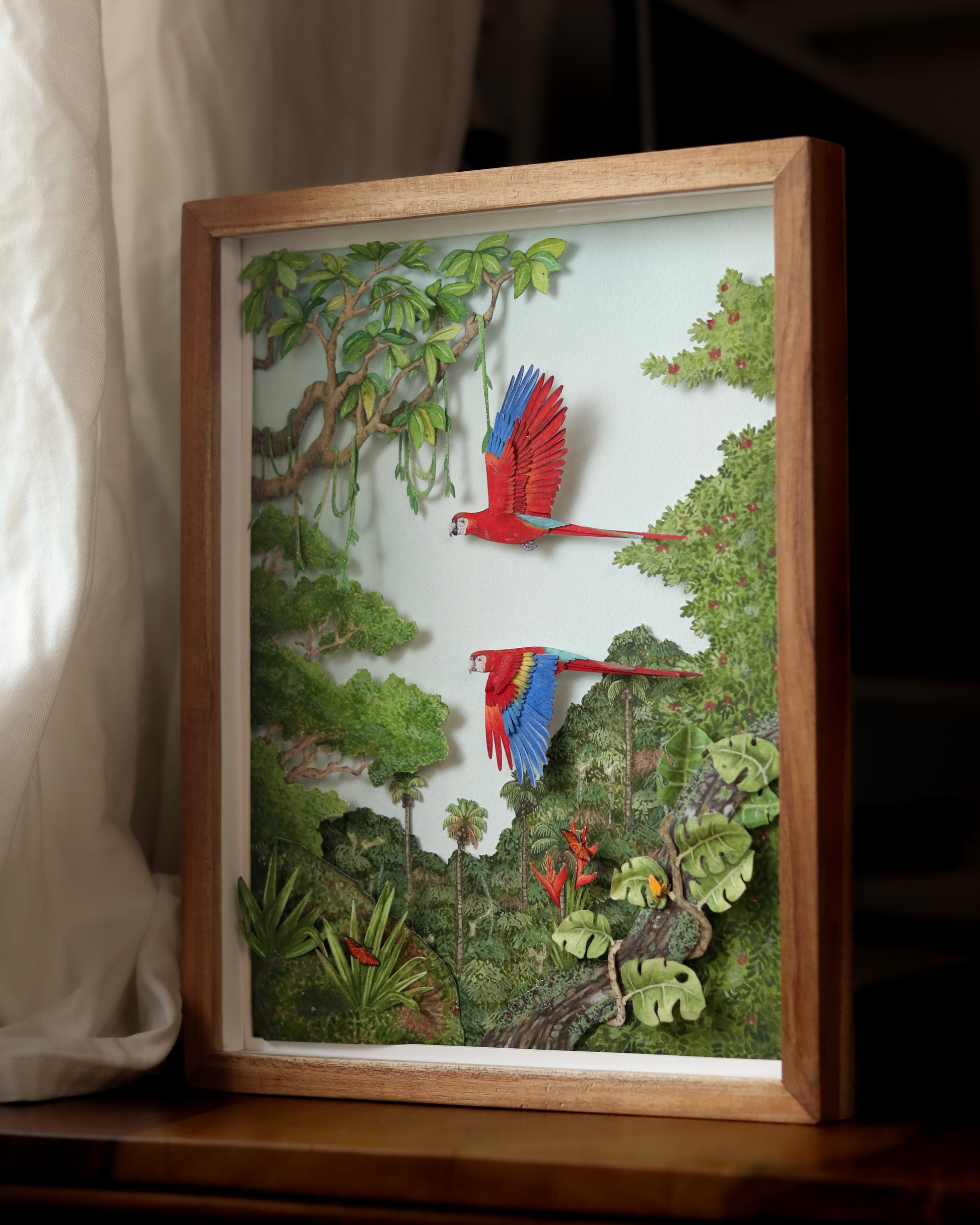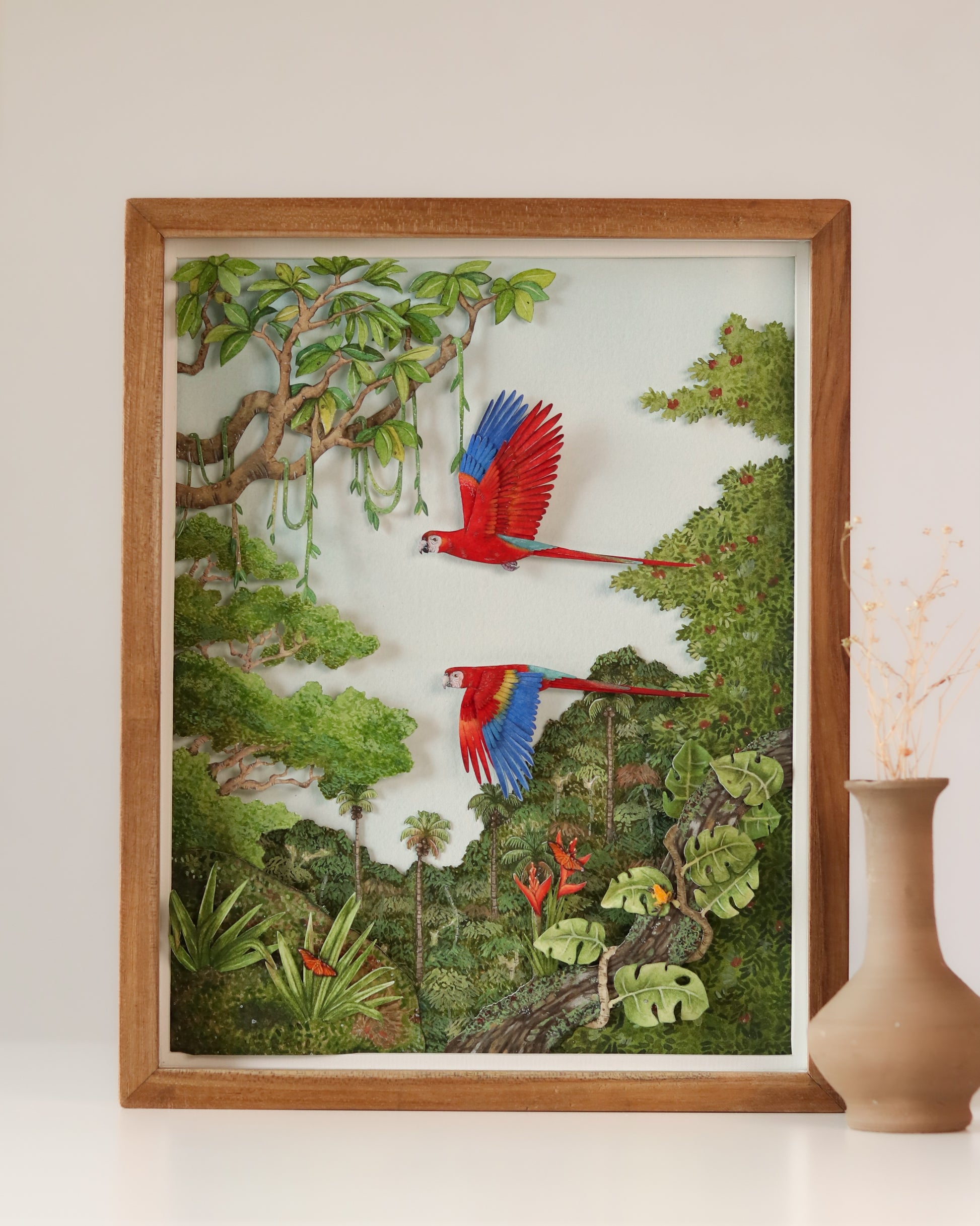 Bring the wild heart of the Amazon into your space with this exquisitely detailed framed diorama, featuring two scarlet macaws soaring through the lush rainforest canopy. Every leaf, vine, and creature has been meticulously hand-cut and painted to reflect the breathtaking biodiversity of the Amazon Rainforest.