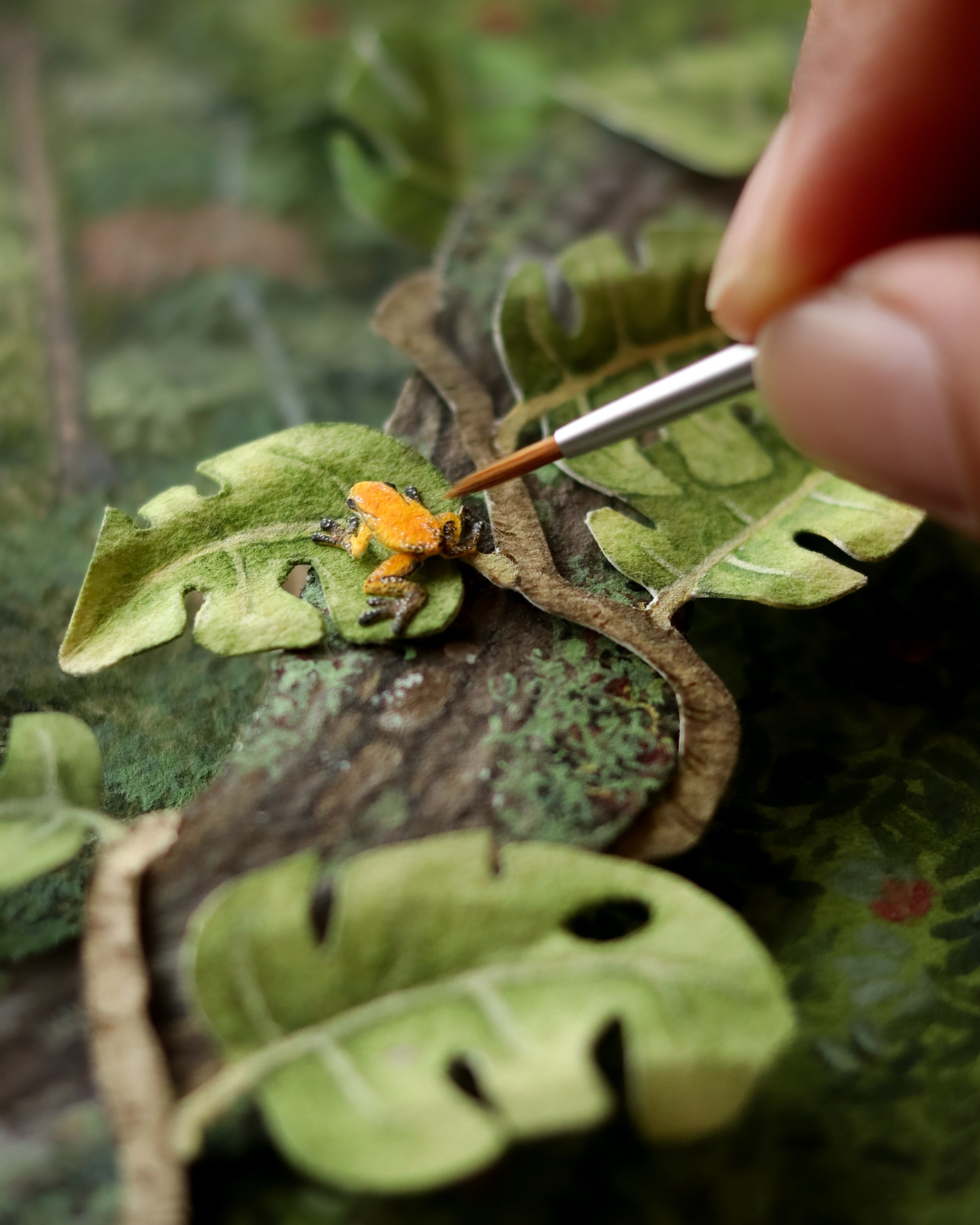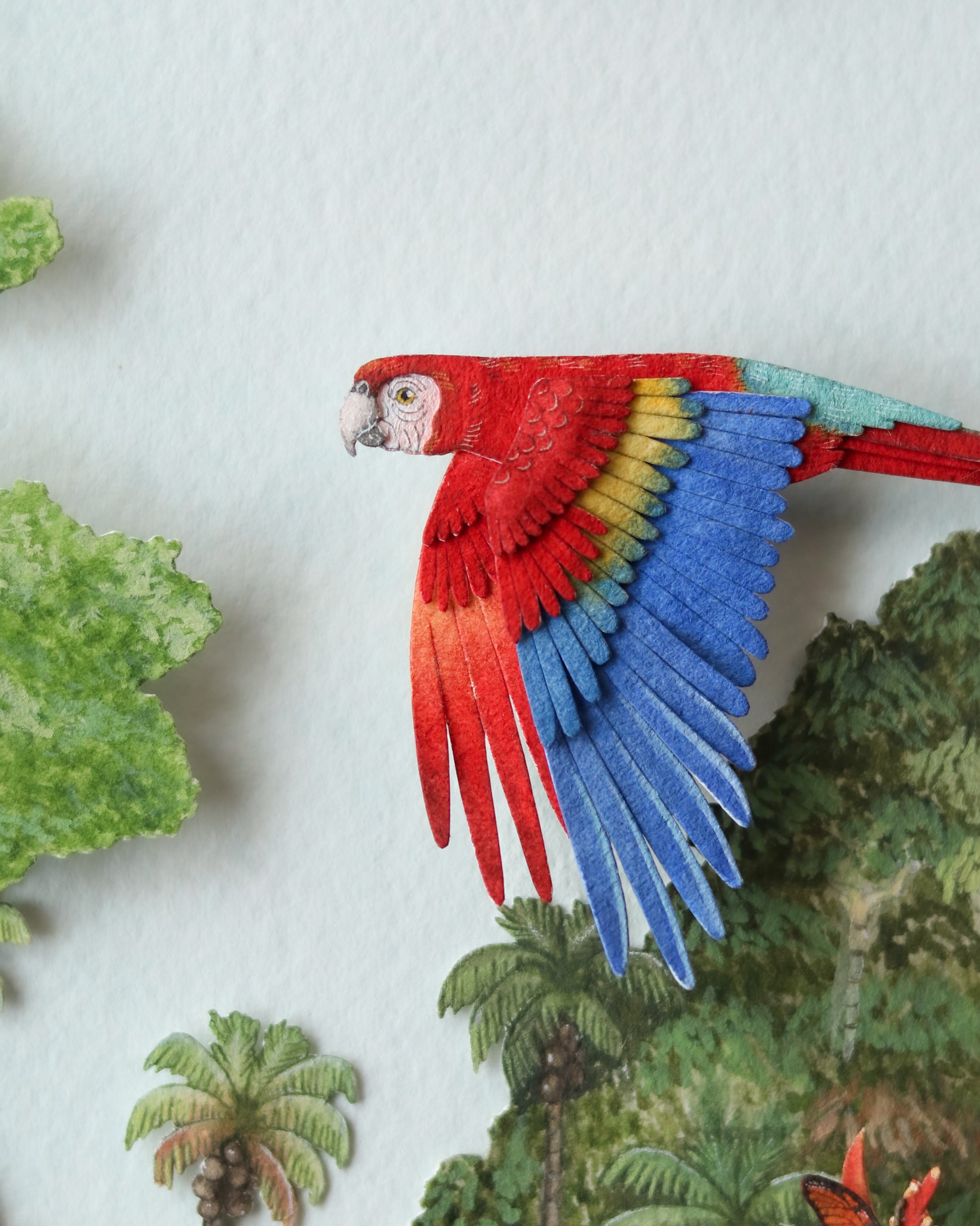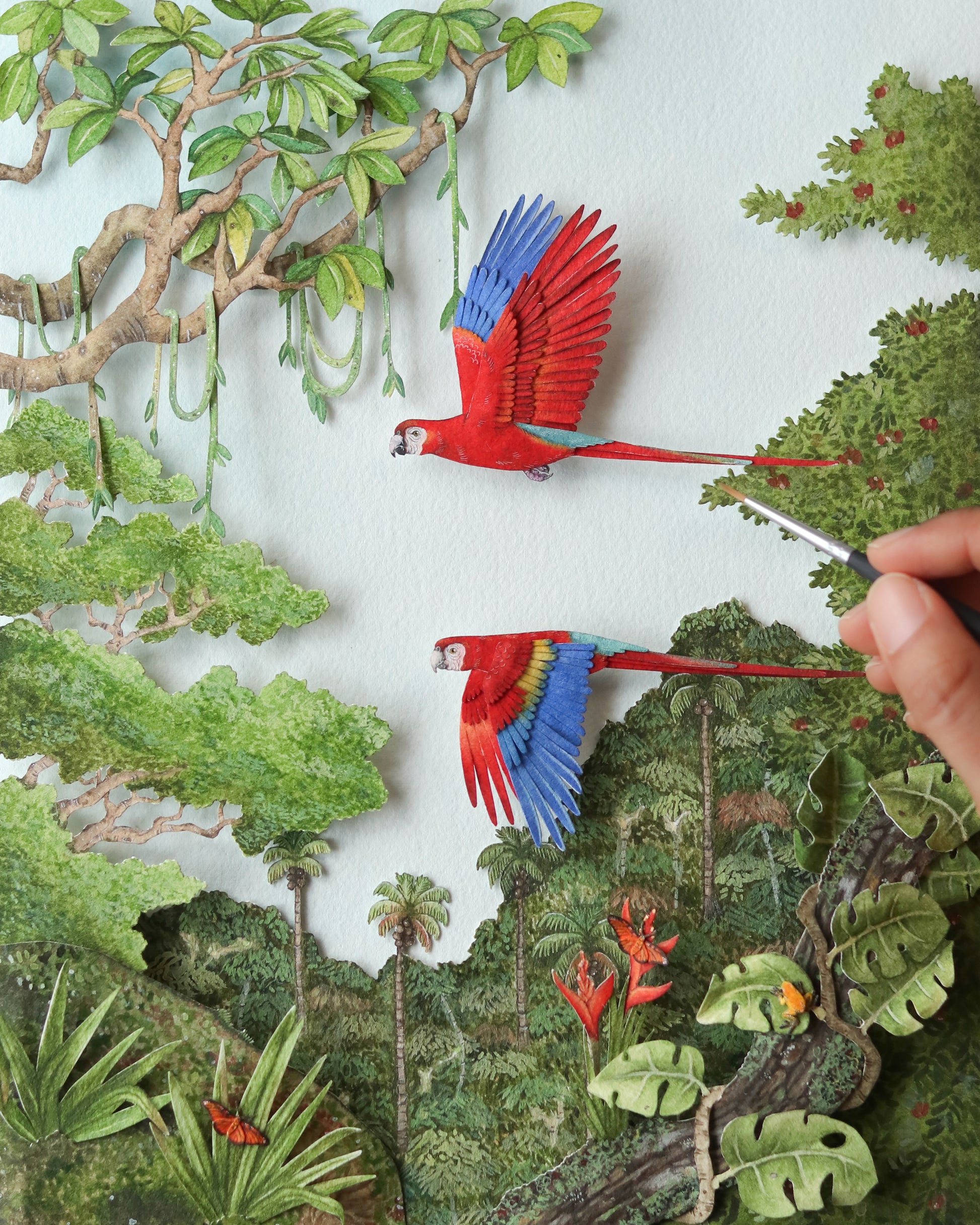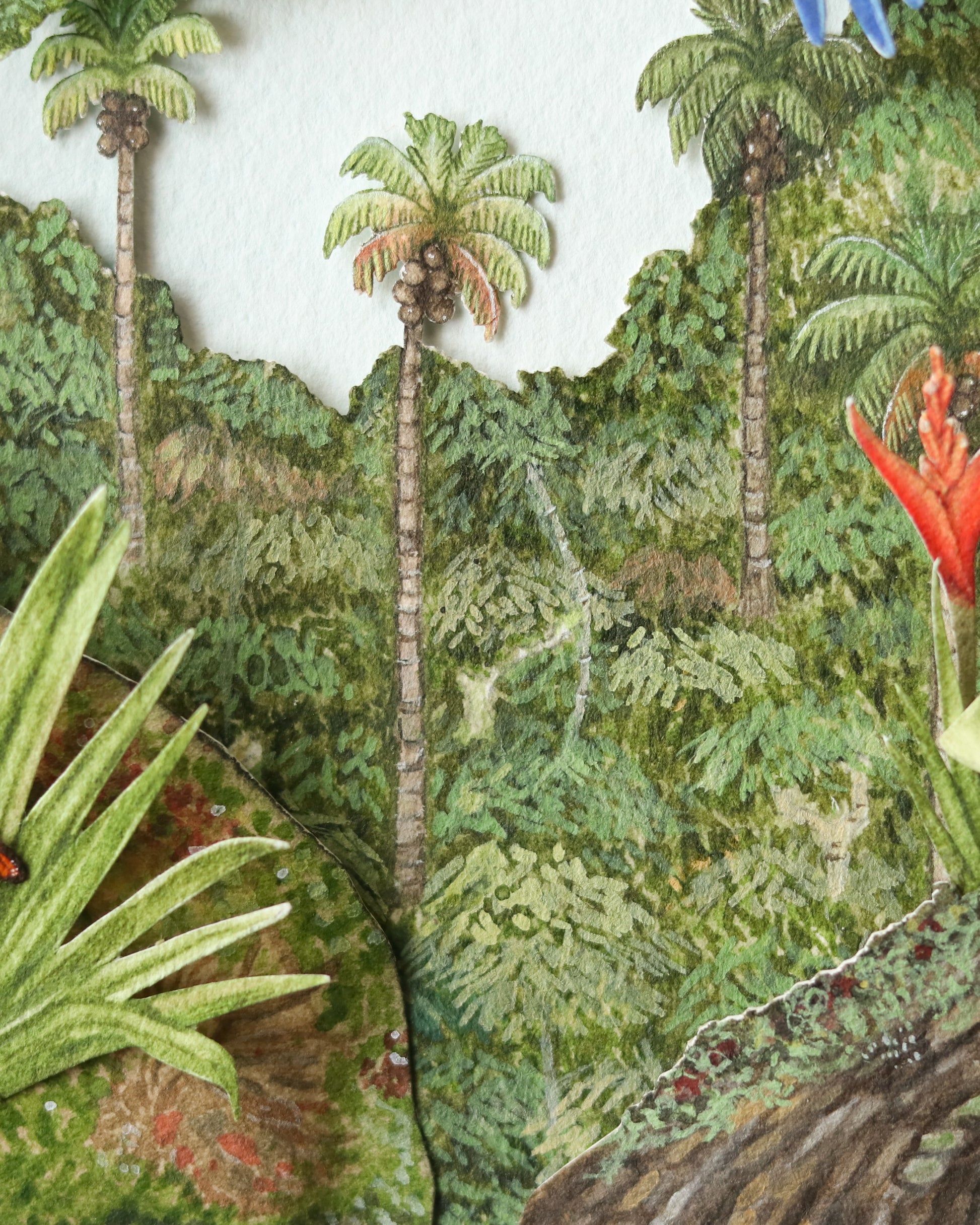 Crafted with over 25 individual layers of premium archival paper and brought to life with gouache and watercolour detailing, this miniature scene captures the vibrant beauty and ecological richness of one of the world’s most vital ecosystems.