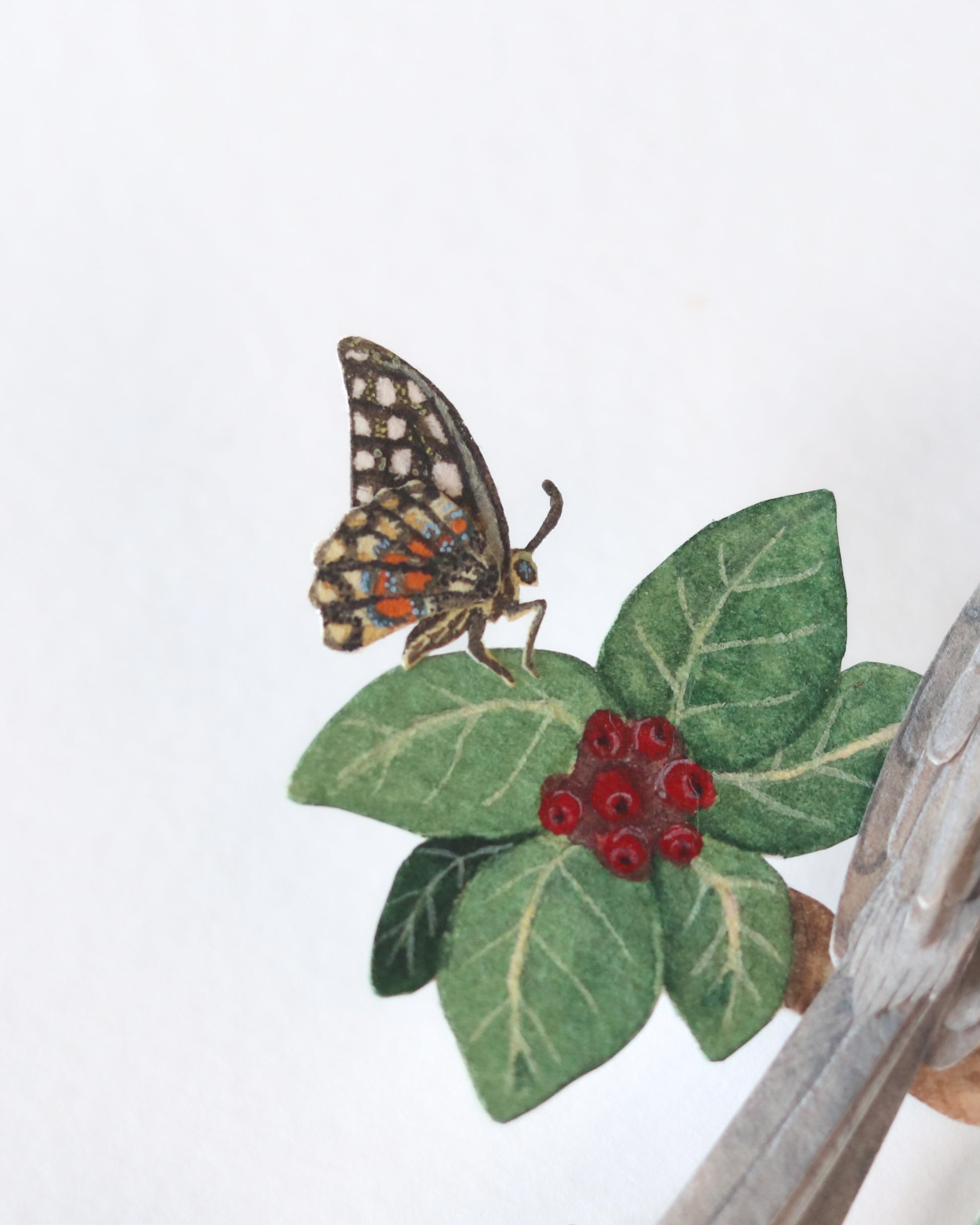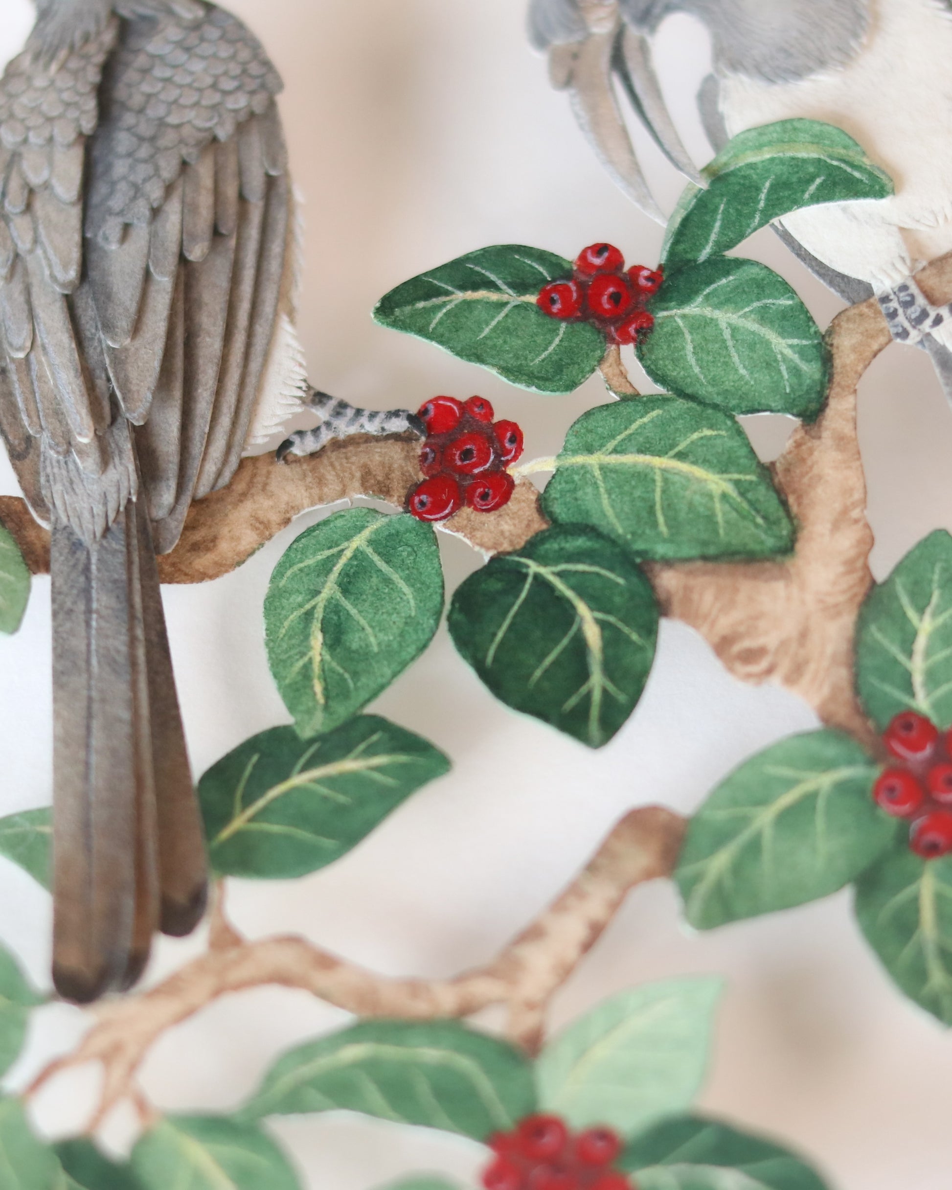 Handcrafted in layered paper with fine detail, this piece continues the series’ celebration of harmony between birds and their natural floral surroundings, highlighting the quiet relationship between wildlife and the trees that sustain entire ecosystems—all rendered in miniature form.