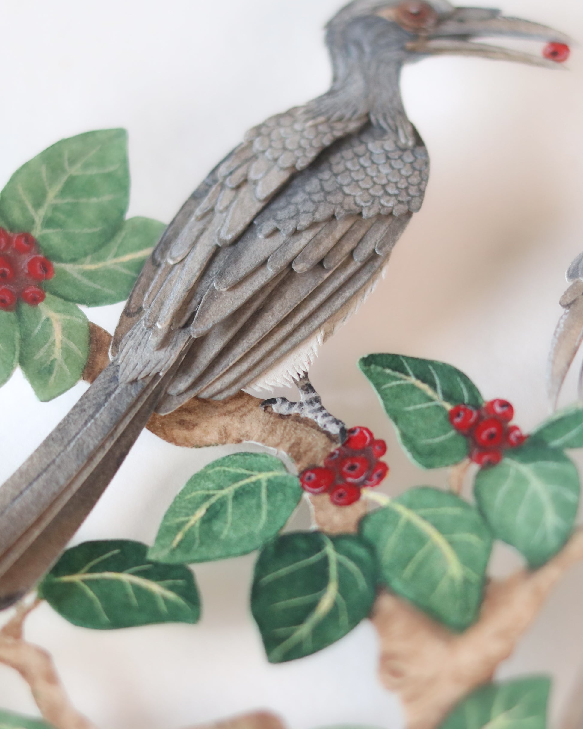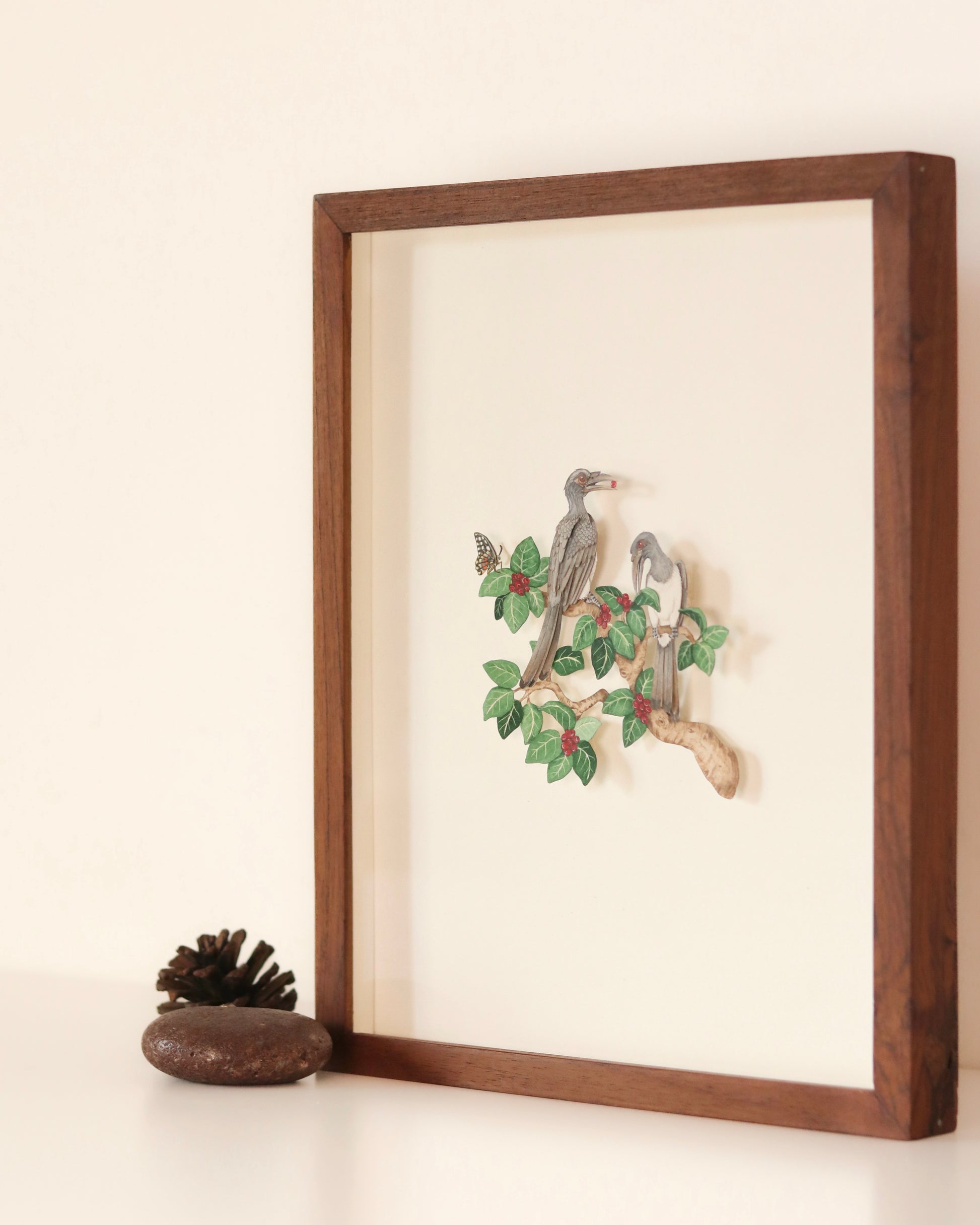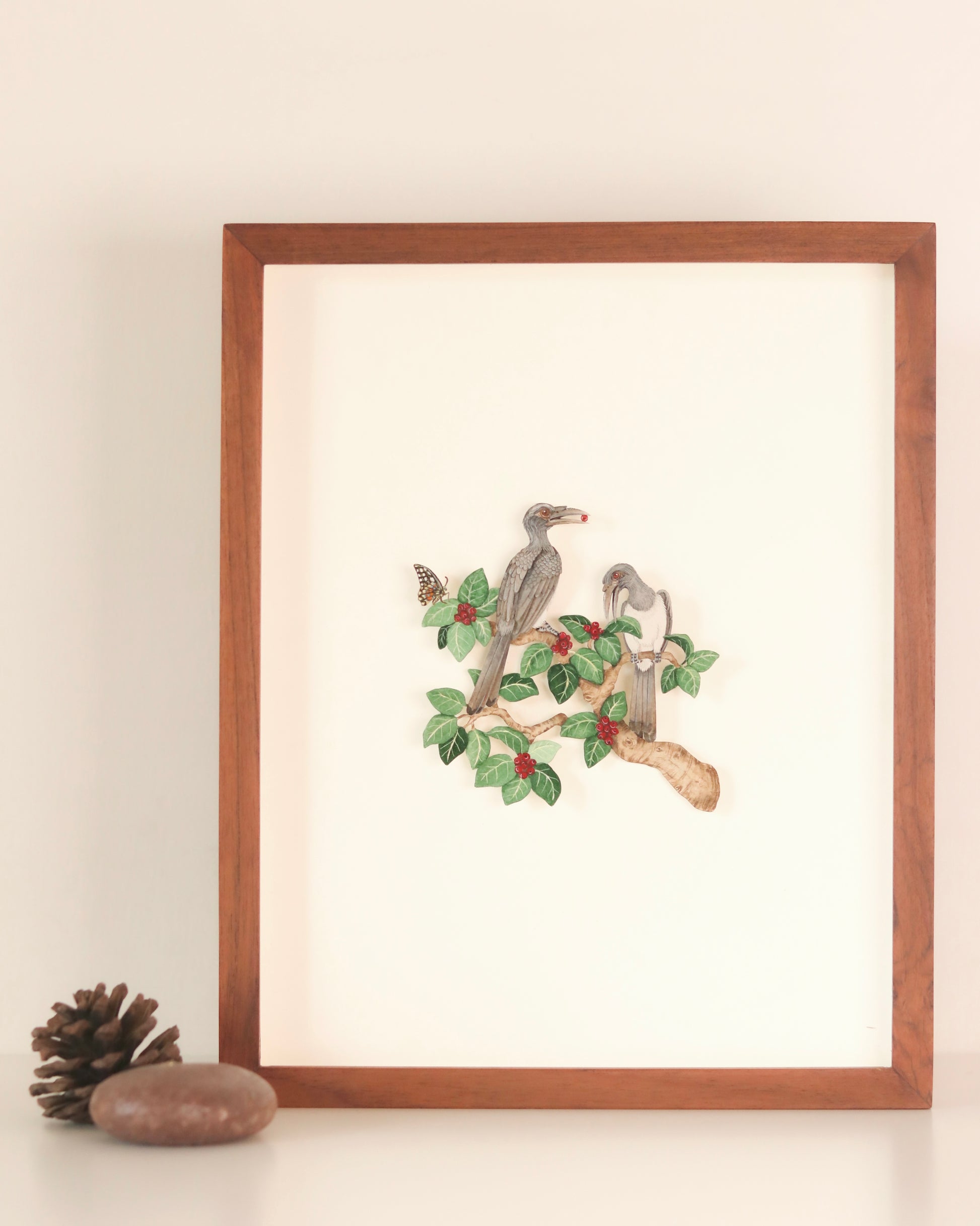 This intricate paper artwork portrays a pair of Indian Grey Hornbills perched within the spreading branches of a banyan tree, enjoying its ripe berries. With their distinctive curved bills and soft, expressive presence, hornbills are vital seed dispersers and enduring symbols of forest continuity and renewal.