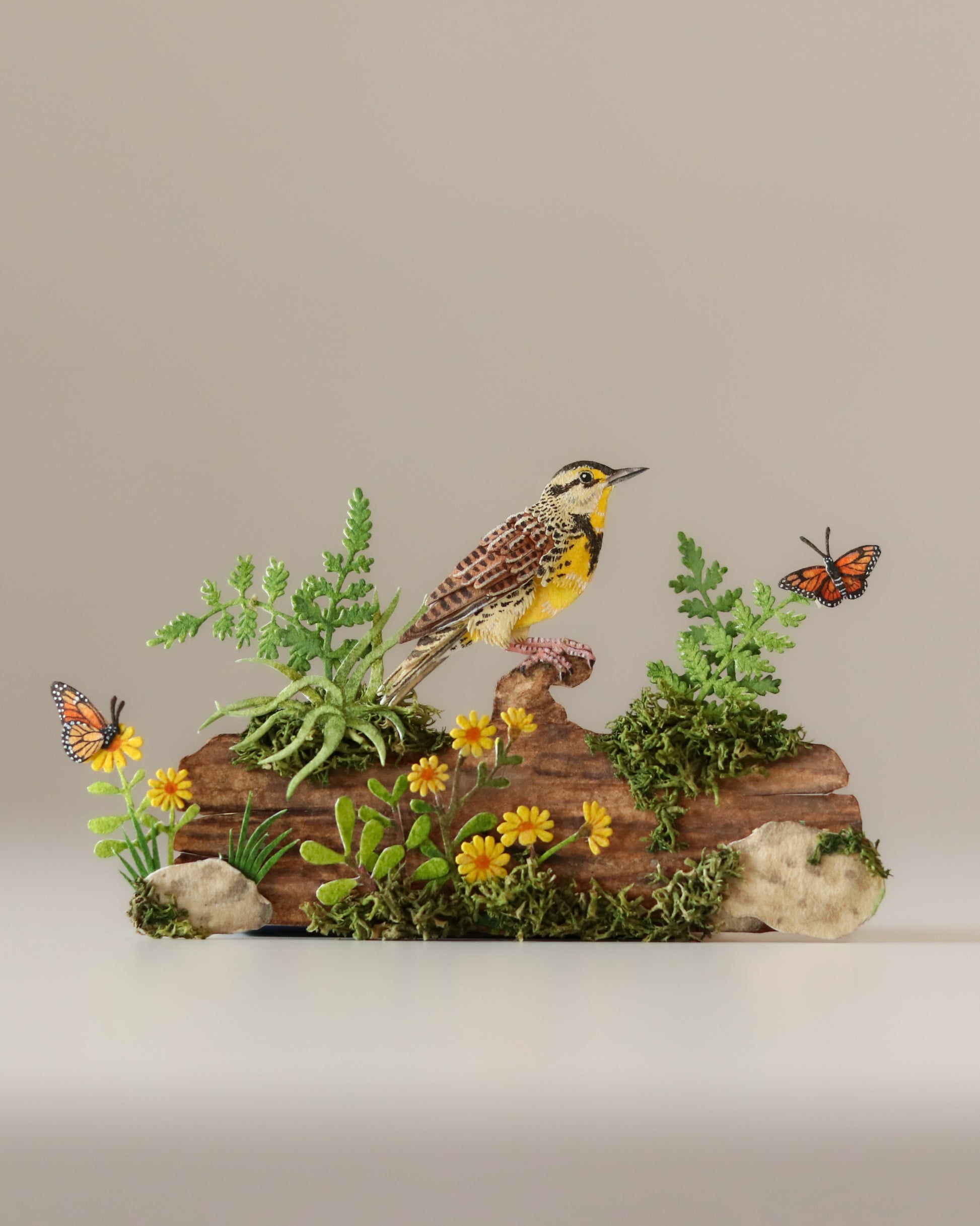 The second in our Birds in Blooms series, this intricate paper artwork depicts the Eastern Meadowlark among soft meadow blossoms. Known for its flute-like song and golden breast, the meadowlark is a symbol of open grasslands and summer skies.