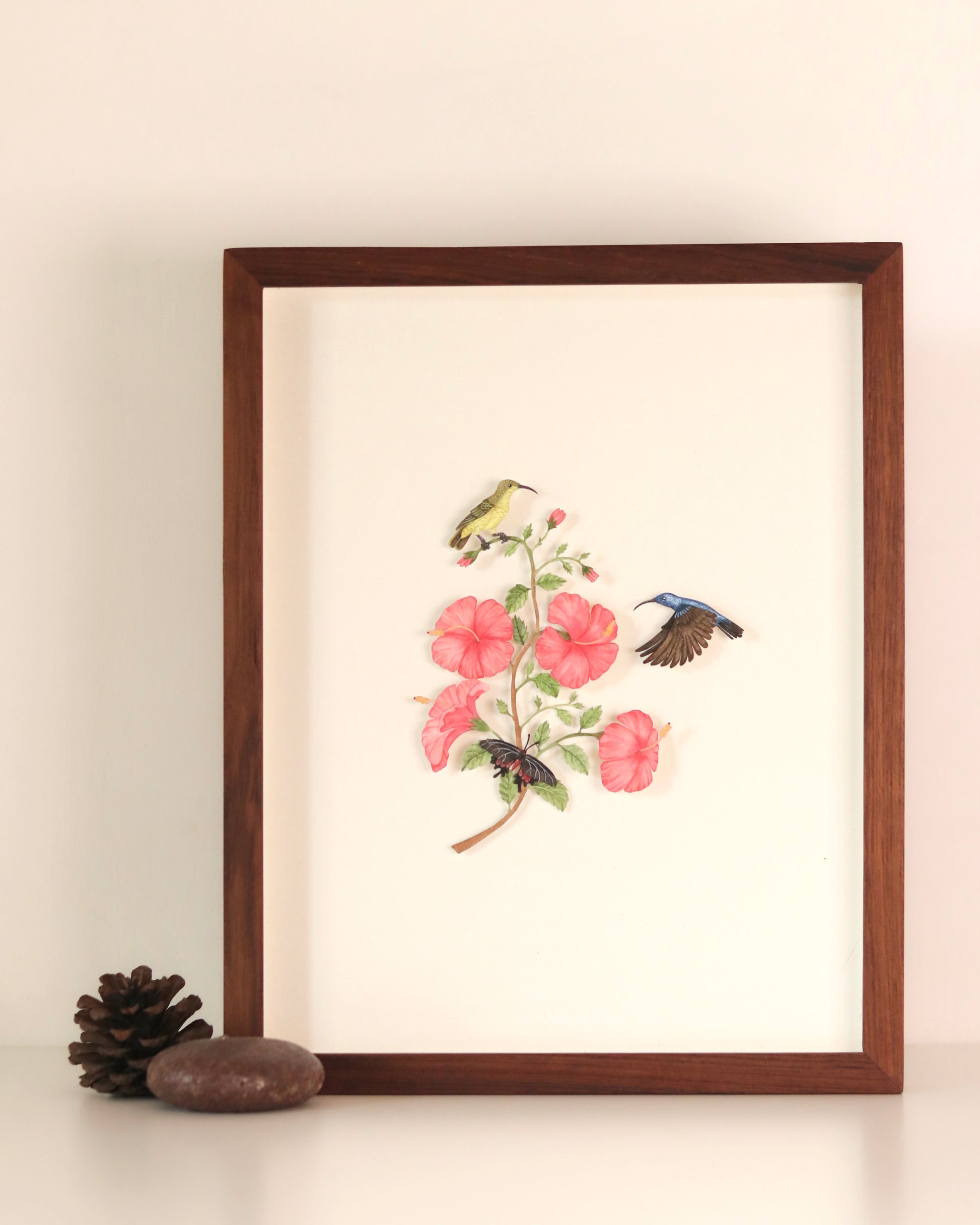 This intricate paper artwork captures a pair of Purple Sunbirds hovering delicately over a blooming hibiscus flower. Known for their iridescent plumage and rapid, hummingbird-like flight, sunbirds are vibrant pollinators and symbols of tropical abundance and energy.