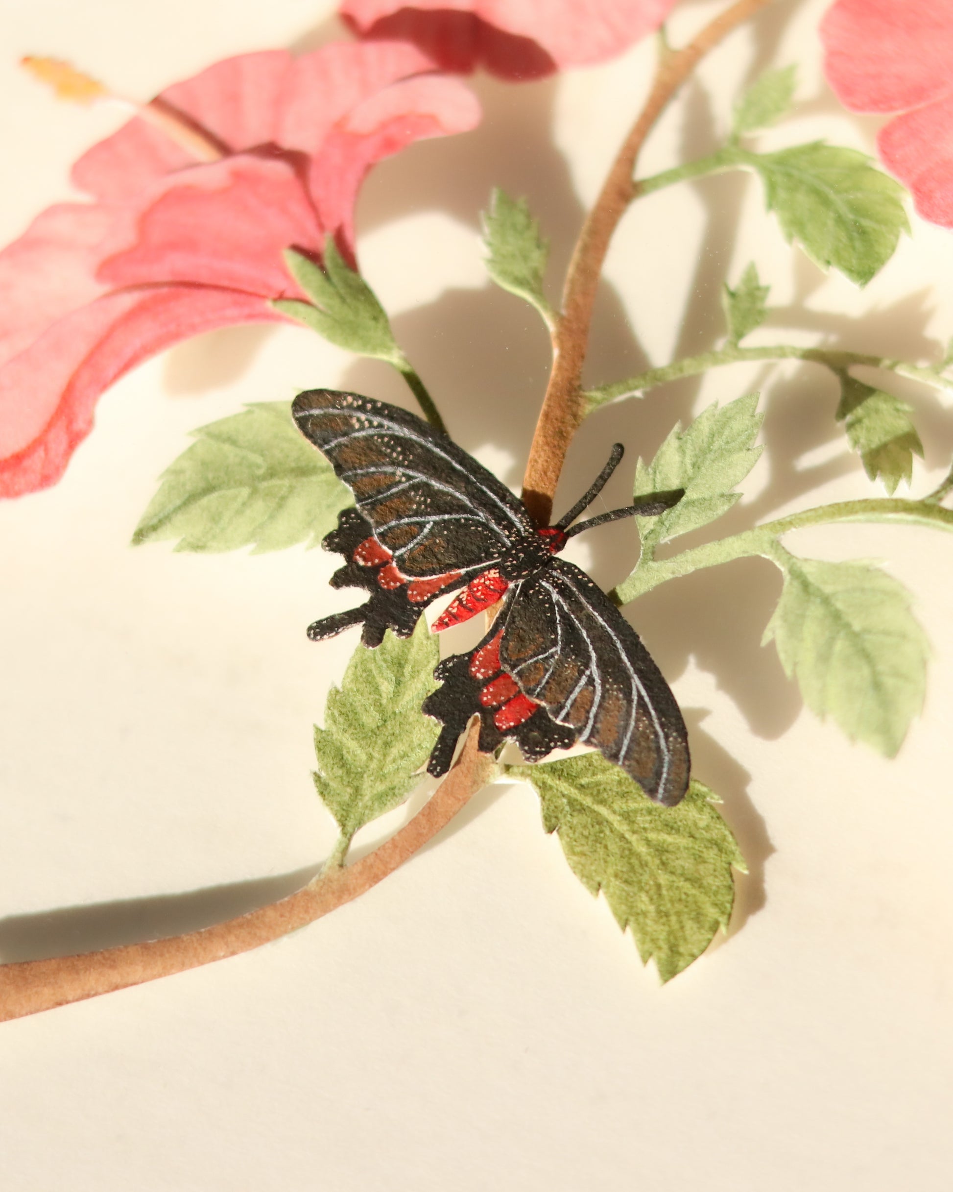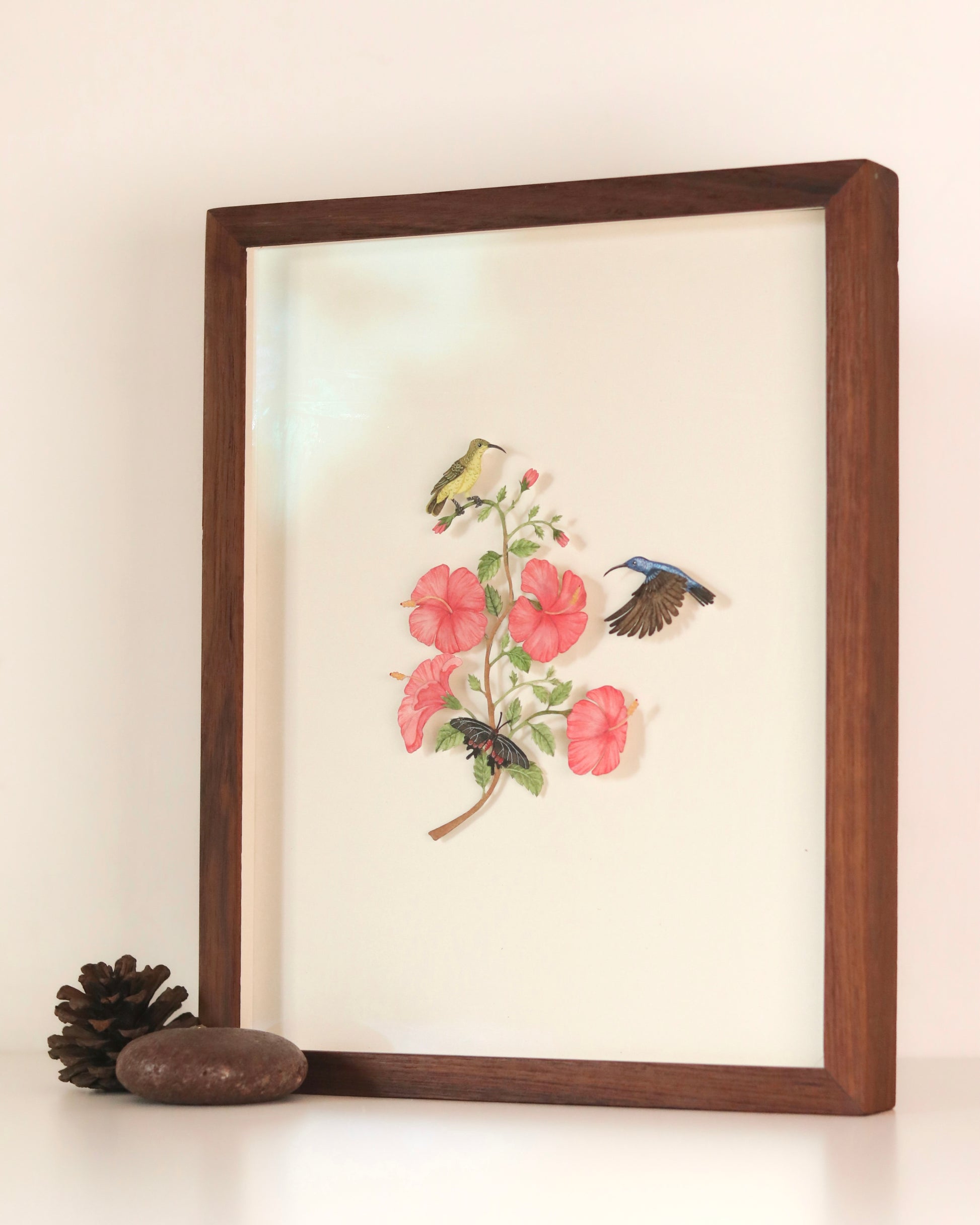 Handcrafted in layered paper with fine detail, this piece continues the series’ celebration of harmony between birds and their natural floral surroundings, capturing a fleeting moment of movement, colour, and life—all in miniature form.
